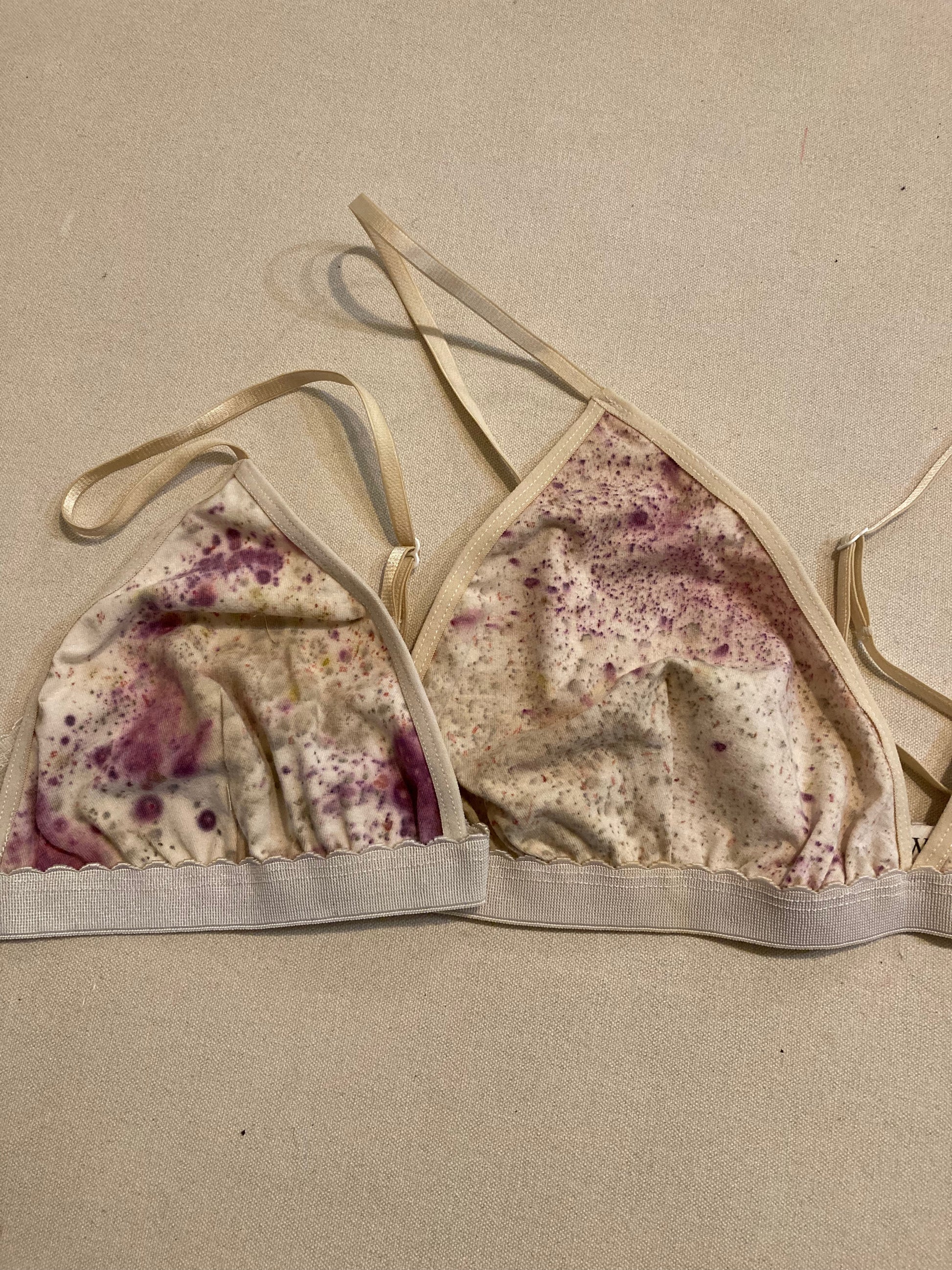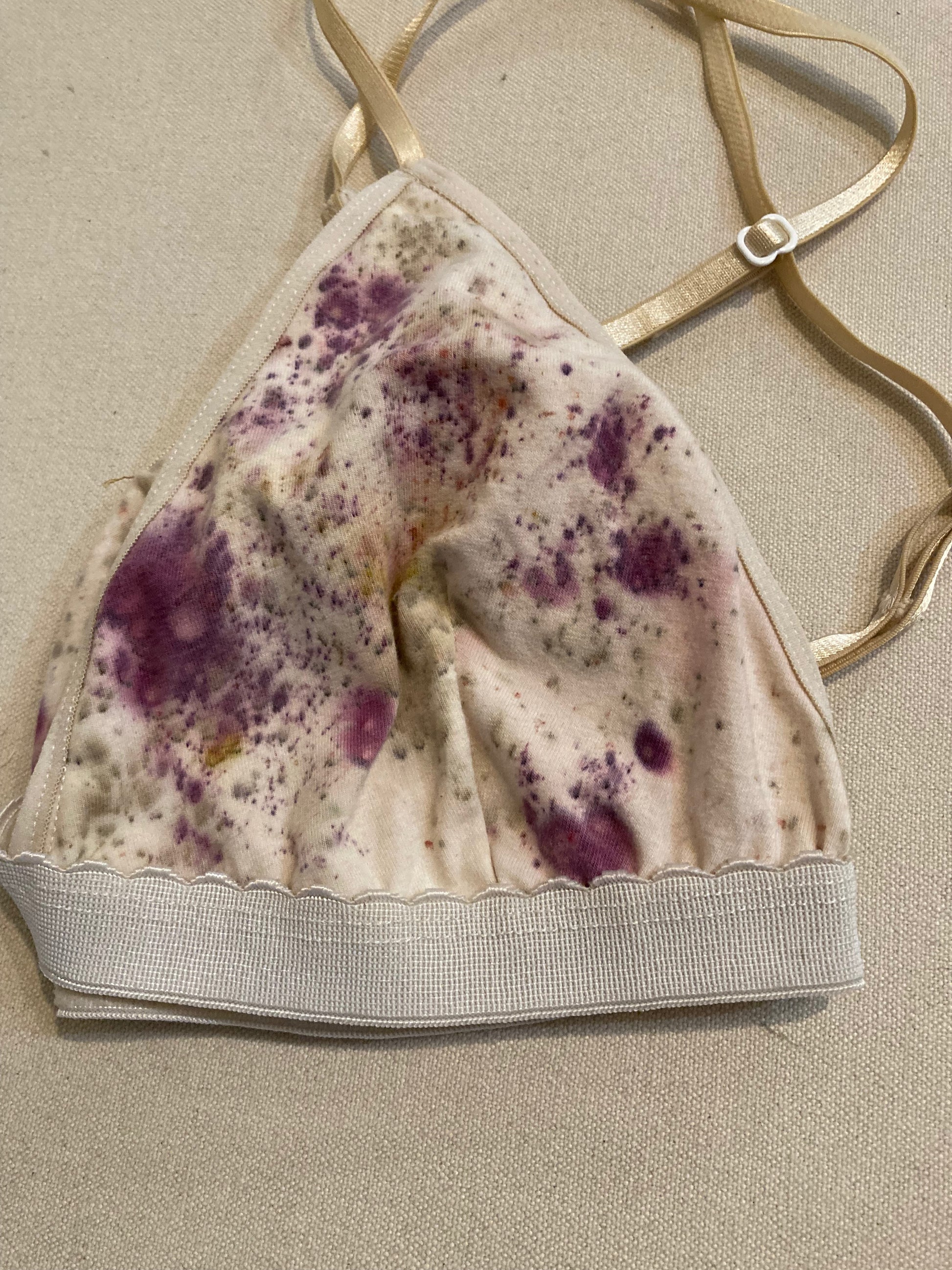 This triangle bra is simple and sexy. Made with organic cotton milled and grown in the USA. The cup is ideal for sizes A - C or a small D. There is two clips for adjusting the size underbust and sliding rings for the elastic straps. The elastics include fold over, soft scalloped and 1/4" strapping.