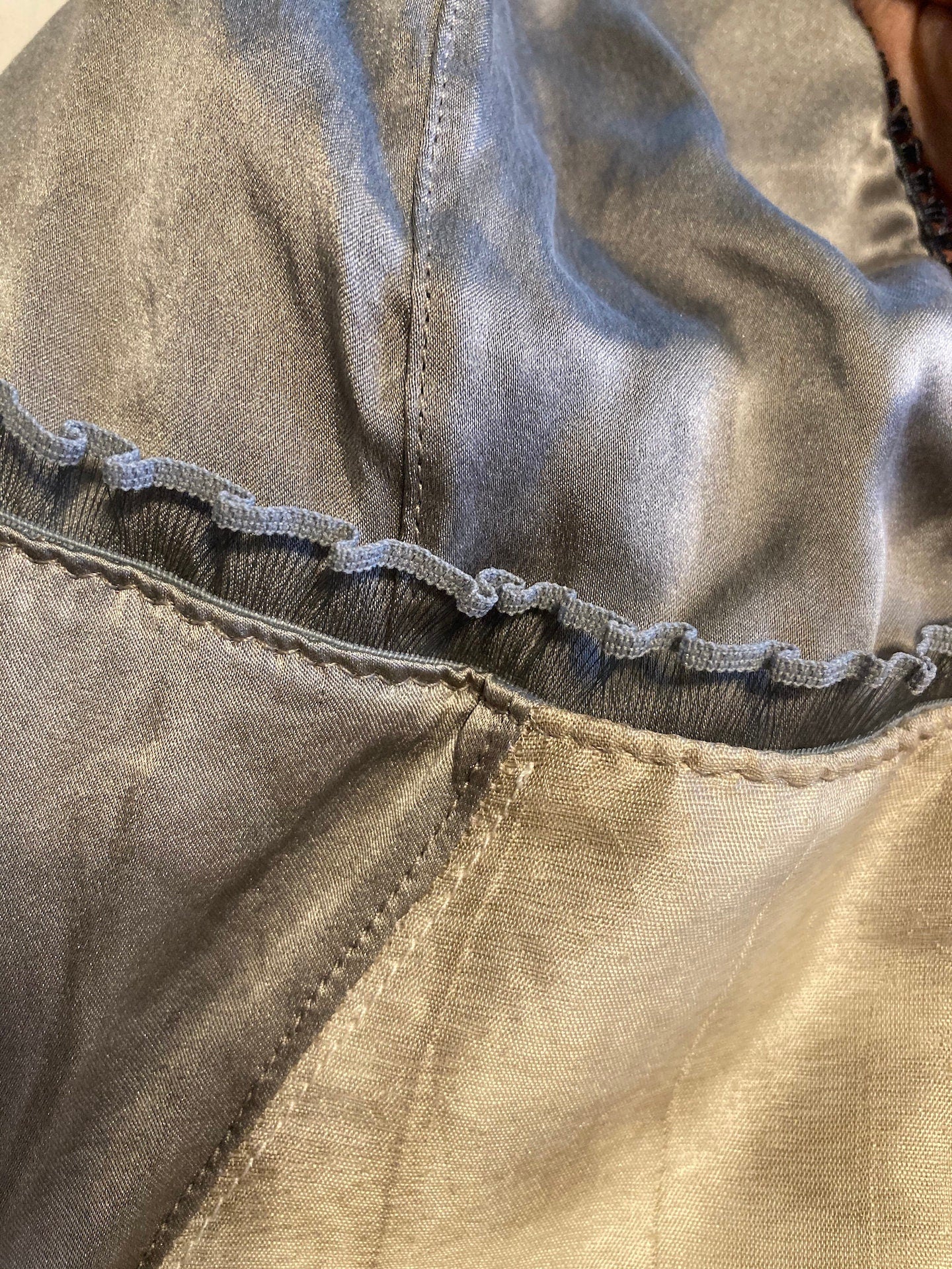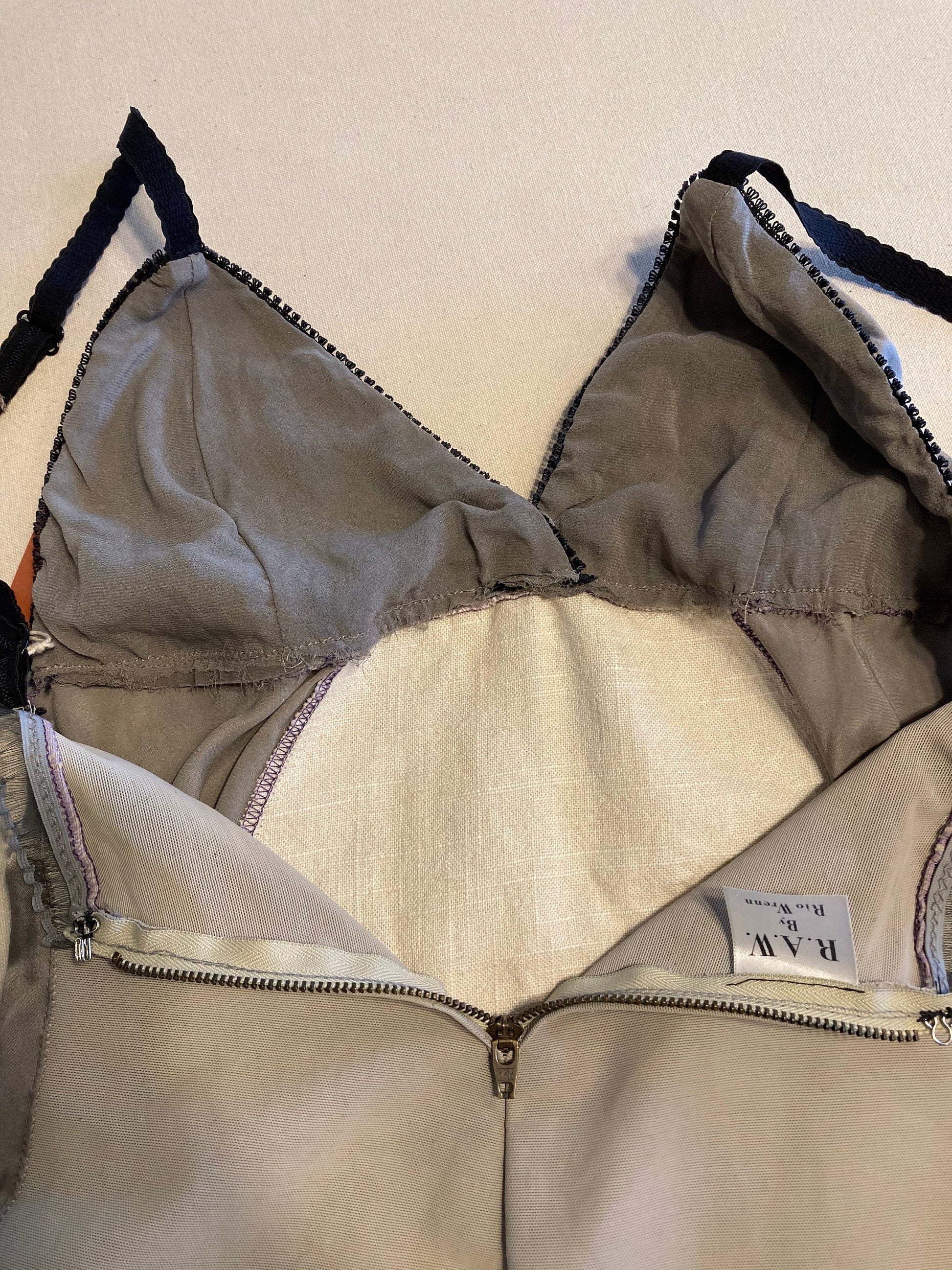 The Belladonna Girdle was made for my 2012 collection. It is actually the sample worn by models for photo shoots so it might have some small flaws and it has a raw finish on some of the inside. I am selling it as is. The material used in making this one of a kind girdle are stretch silk charmuse, vintage silk blend at center, and power knit in the back. It was naturally dyed with a color I call charcoal and the center patterns was made with shibori and a light tannin dye. The center is also lined with a strong cotton fabric. The cups are lined with silk chiffon and should fit up to a C cup. The straps are adjustable as you might find in a bra. at the bottom there is a cute garter detail that is attached with elastic. There is a french fringe elastic detail on the bottom and under the cups which I also custom dyed. This piece can stretch to fit your curves! I would say up to a 40" hip. The waist is 28" resting so could easily accommodate 30 - 31" Sexy for sure! I recommend hand wash and air dry.