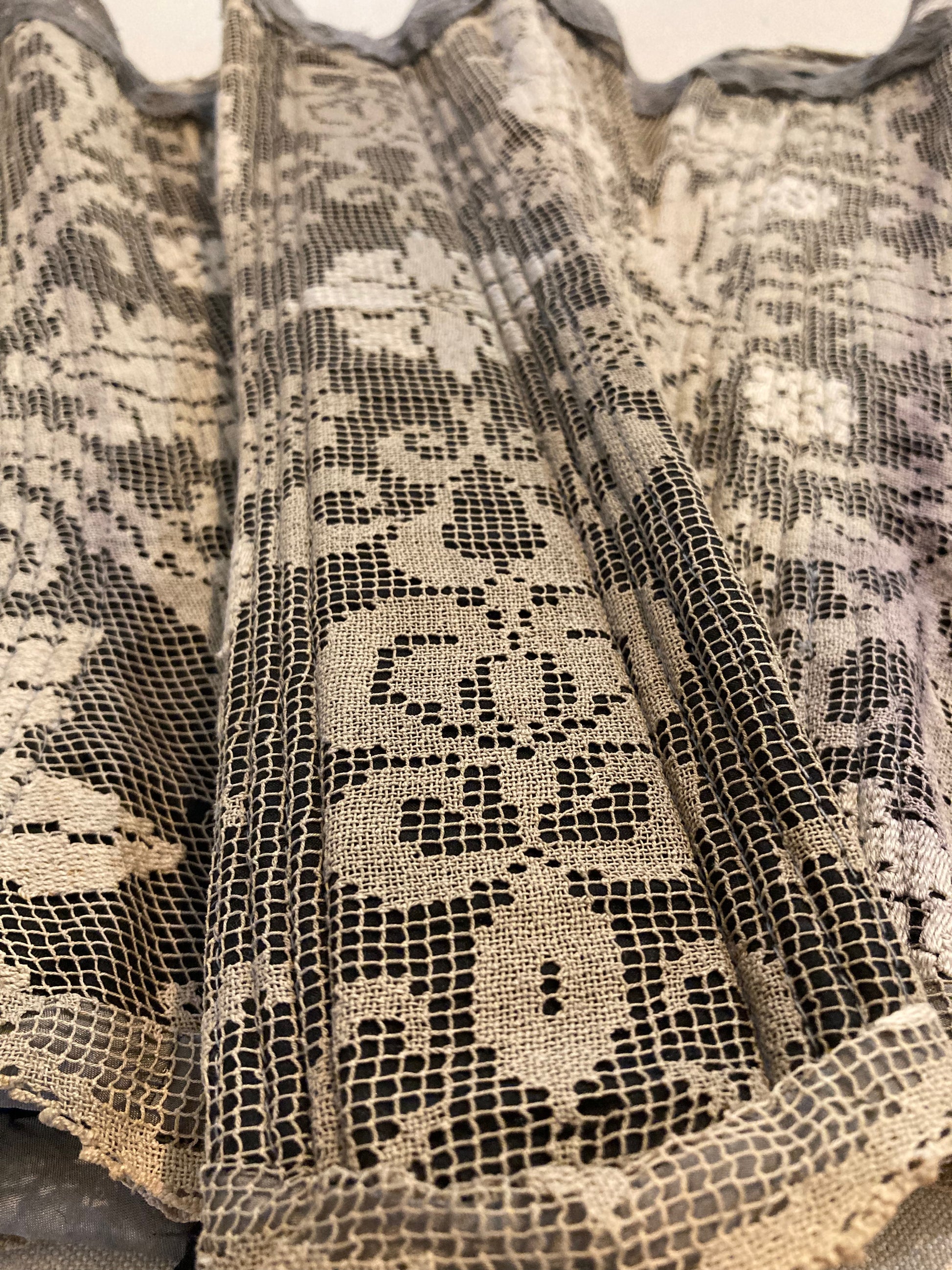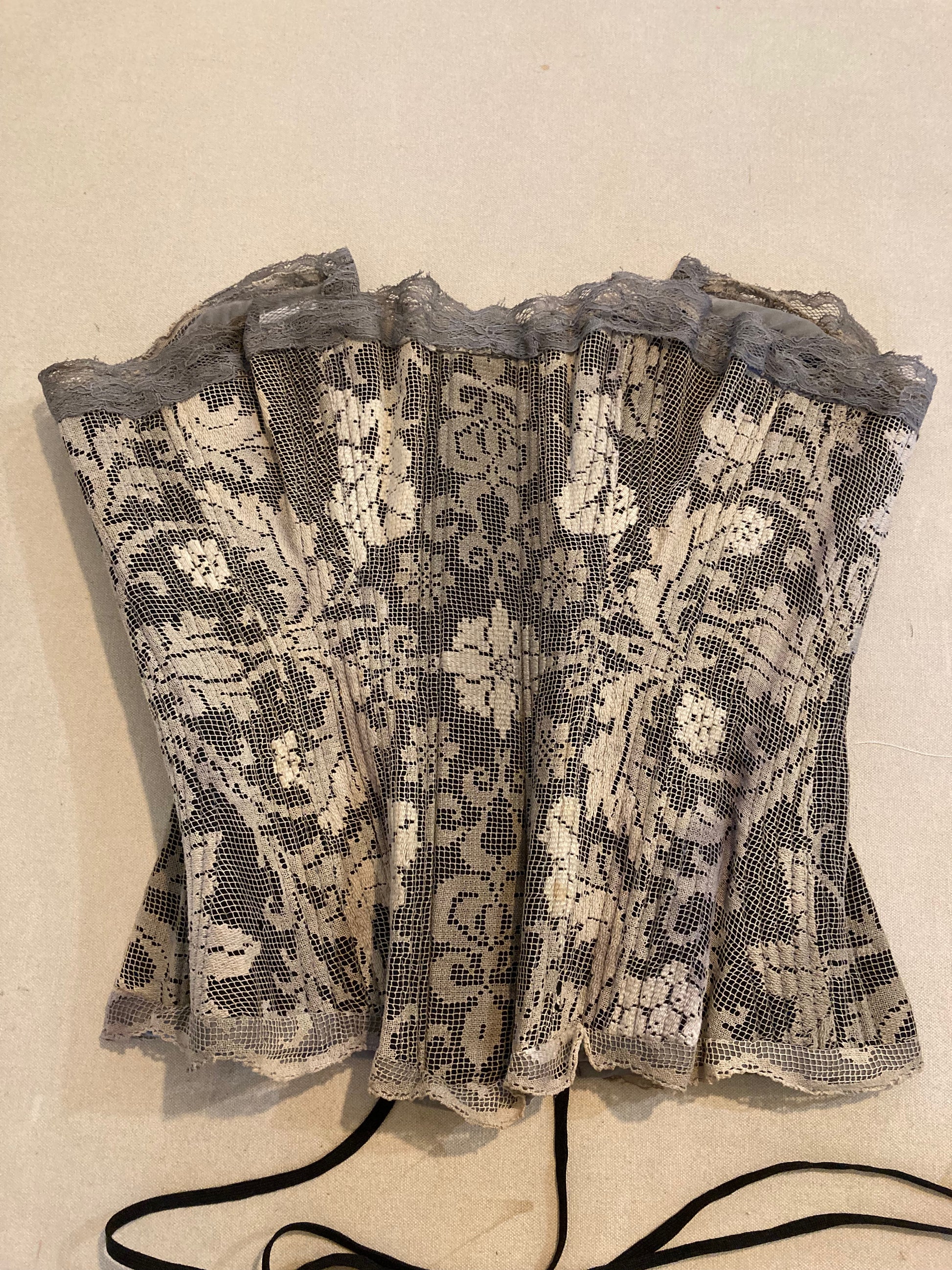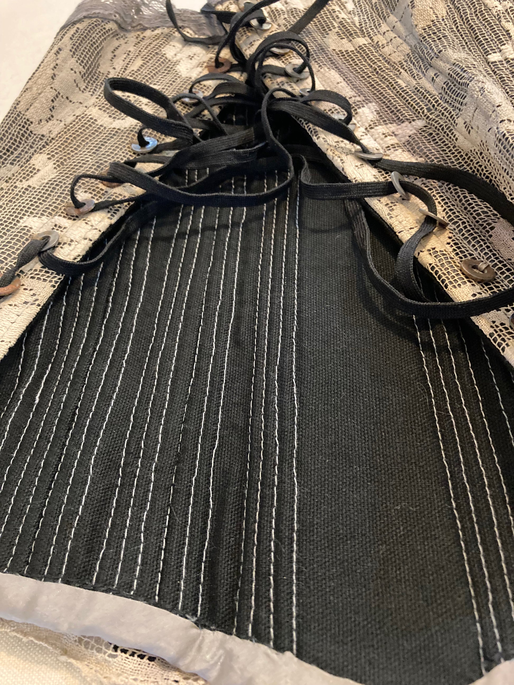 This beautiful corset was made with repurposed cotton lace that was dyed with plants and minerals. The style originates from 1860 which features a wooden busk at front and lace up back. This means you slip over the head and lace from the top down to the bottom where you will tie off in a bow that you can then tuck under corset or in waist of skirt.  Details include cording instead of boning, cotton liner, vintage lace trim at top and bottom, metal eyelets hand sewn for lacing.