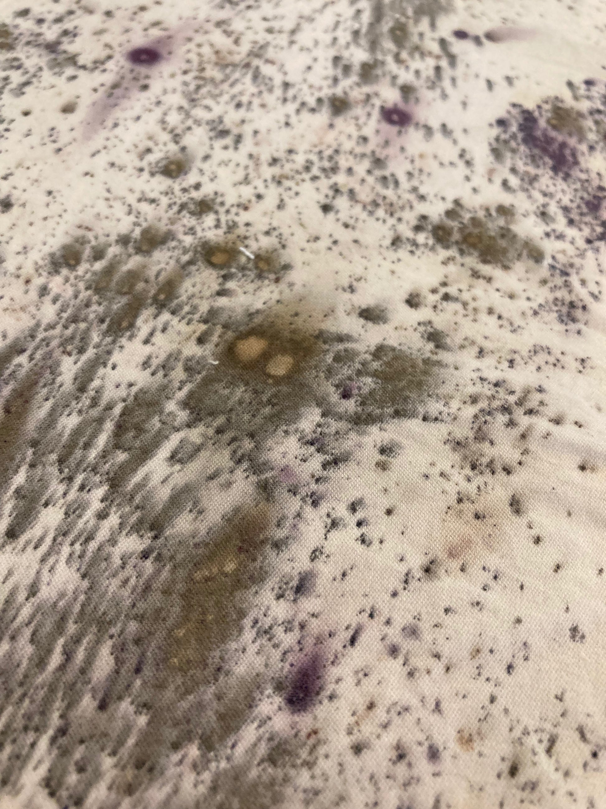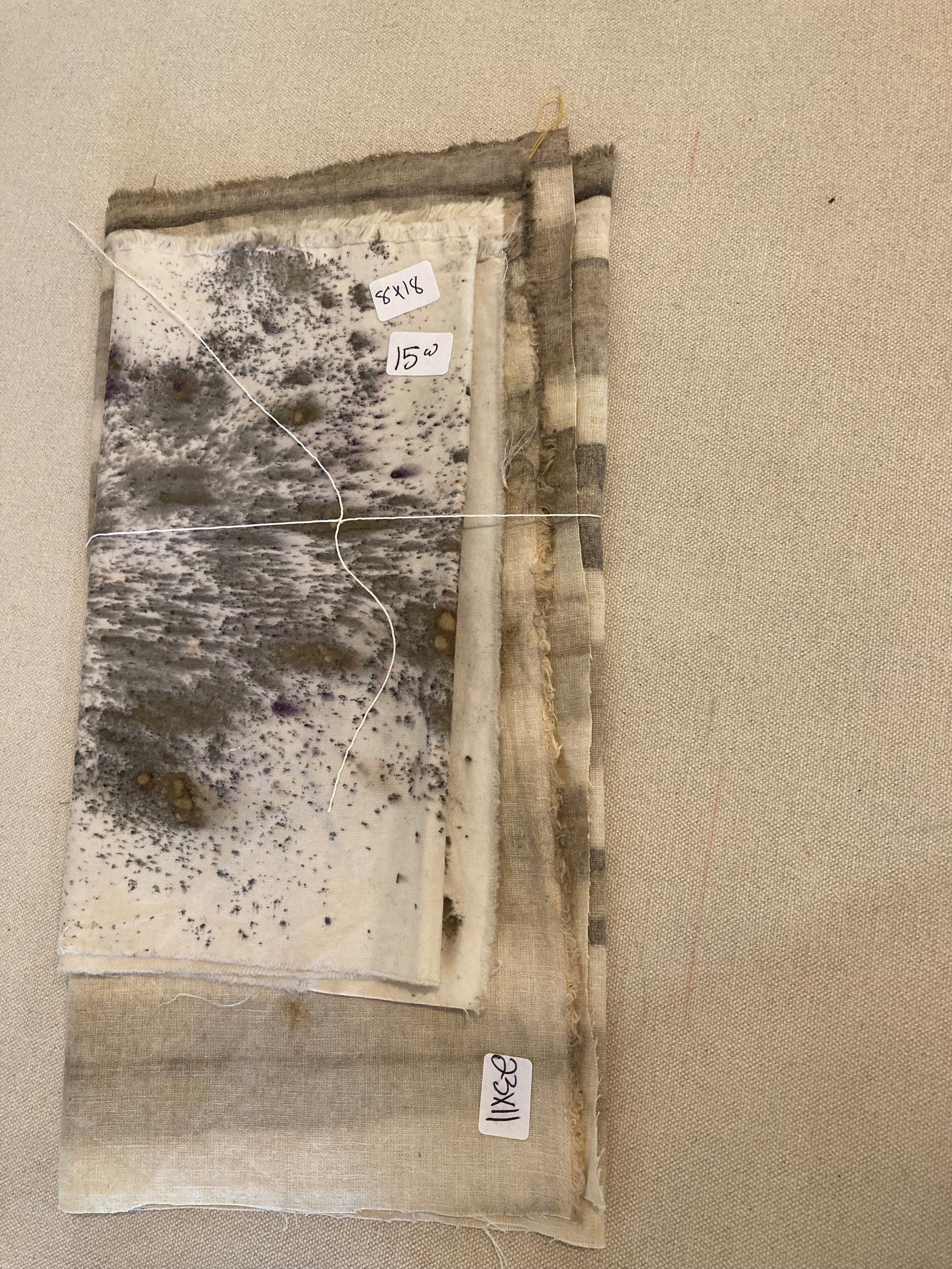 One is an organic suede cotton dyed in foxglove pattern which is a dry print method using, cochineal, tannin, and ferrous sulfate. It measures 8x18 inches