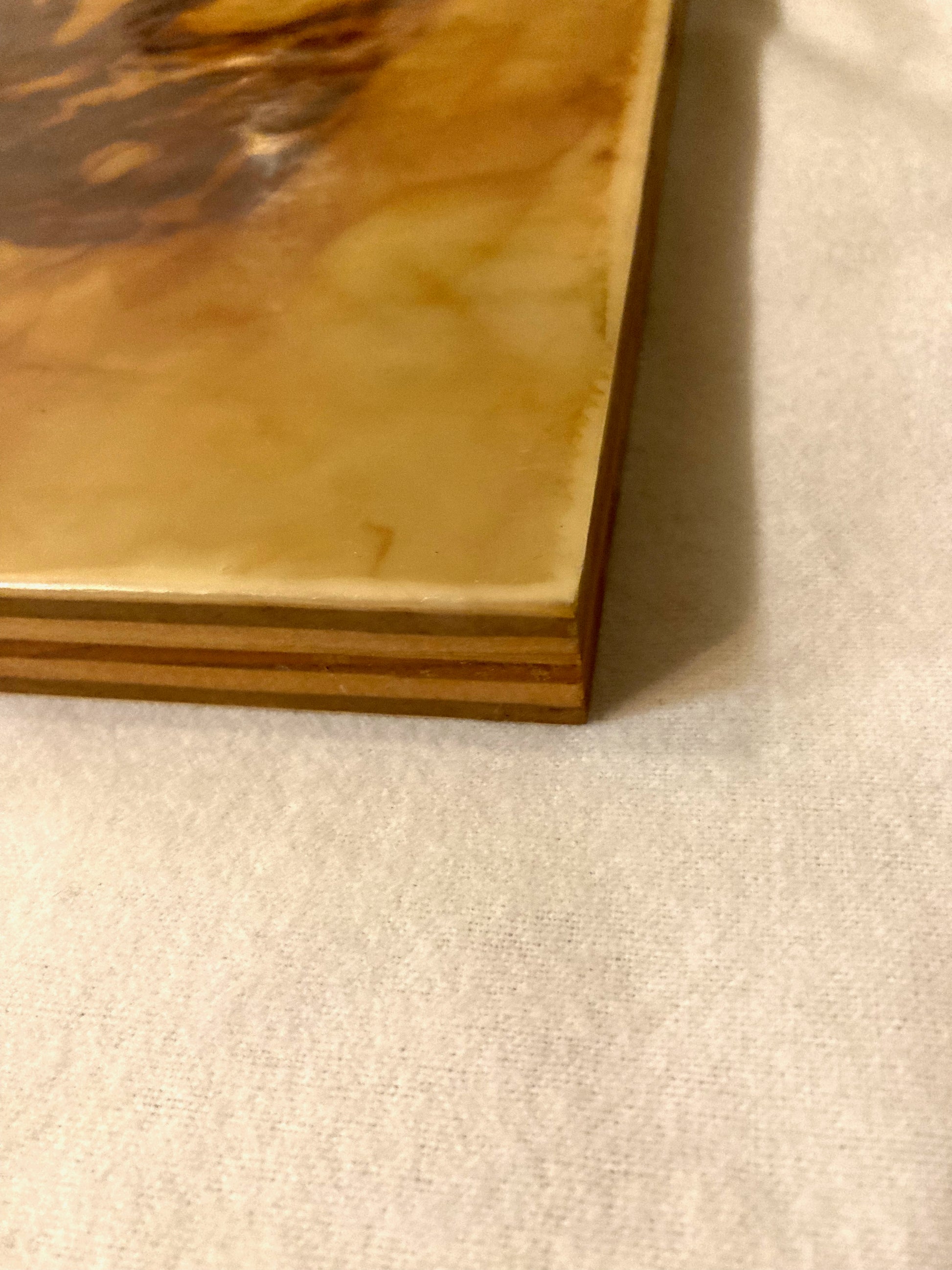 Butterfly Clamp was made with rust printed silk that was shiboried and then laid over a paper mounted 3/4" board. It was then encapsulated with encaustic wax giving it a strength due to the resin to withstand higher temperatures. To keeps it's sheen, an occasional buffing is required.