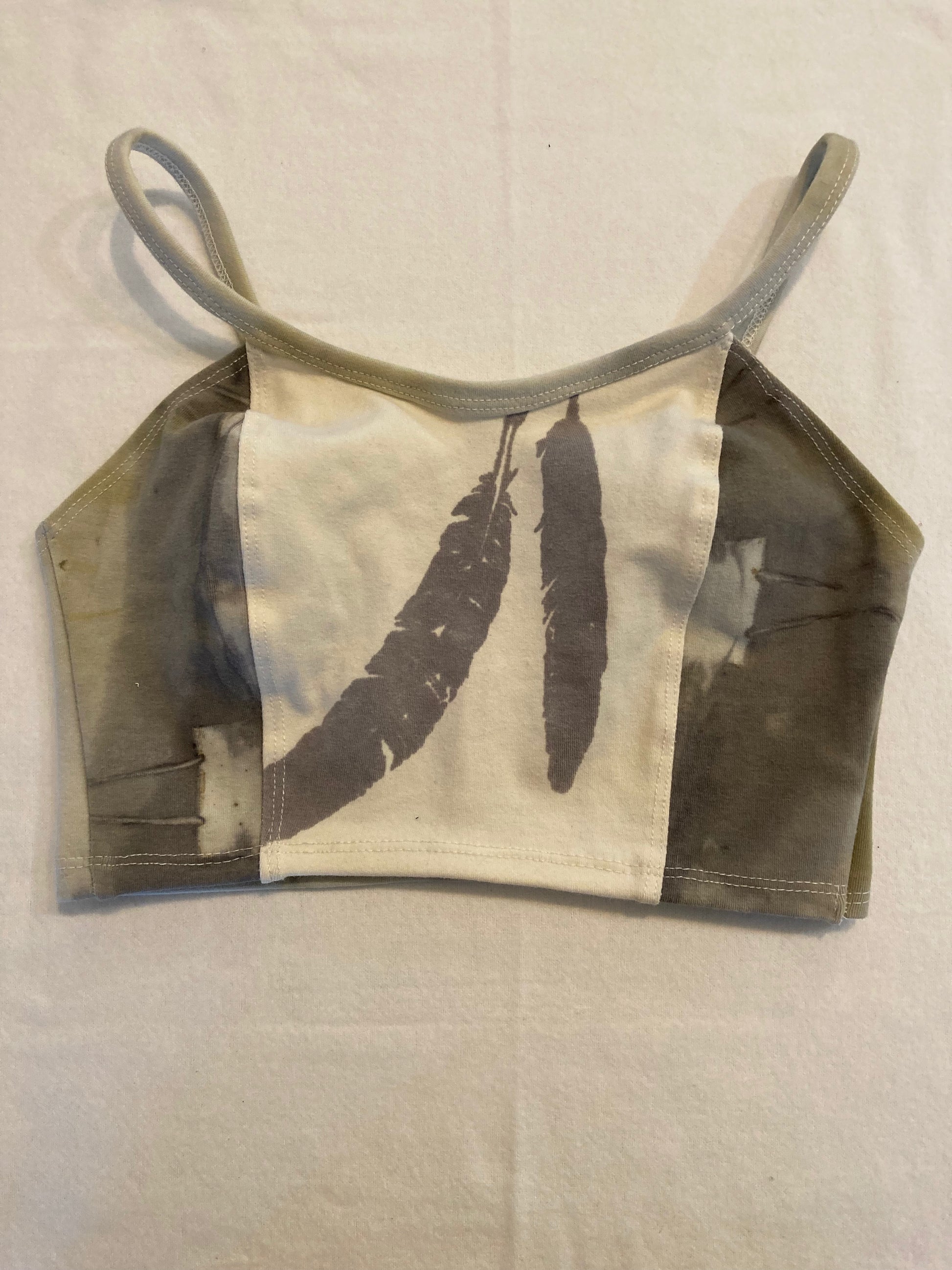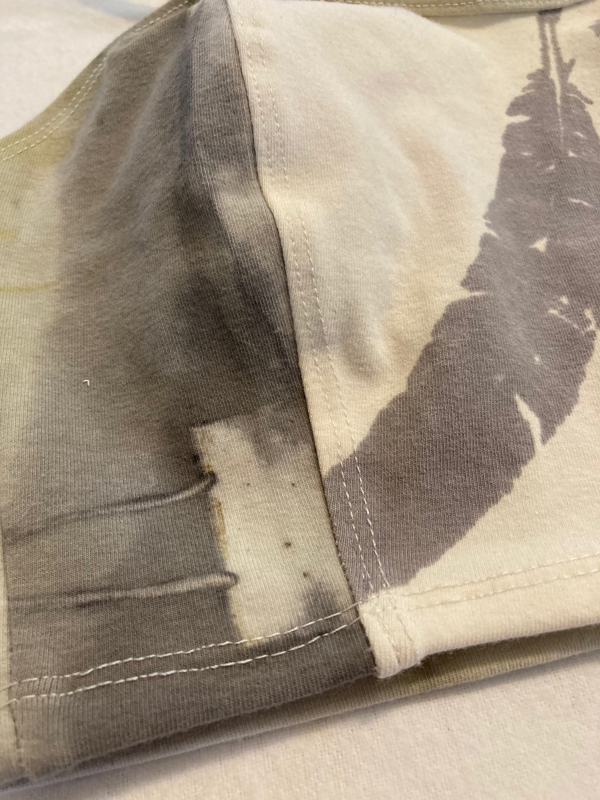Feather - Was dyed with iron and cotinus leaf then silk screened with a feather pattern using natural black ink.
