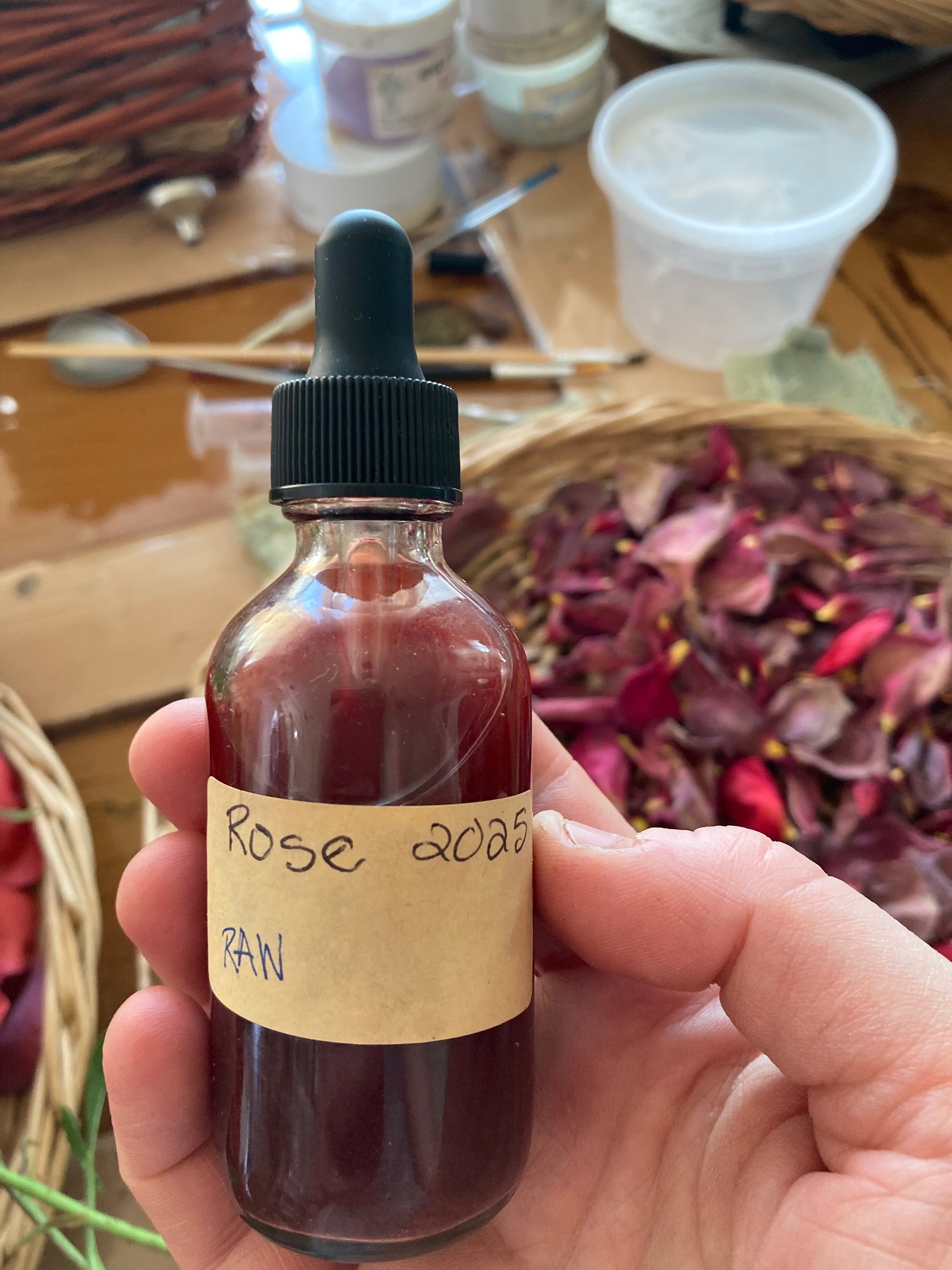 Rose- Harvested from my organic rose bush in Portland, Oregon. The lovely red rose has brought me so much color magic over the years and this ink gives the best blush tones. Sometimes sensitive to constant warm temp and can be prone to mold after a few months. That said I have still used it for ink and always loved the results.