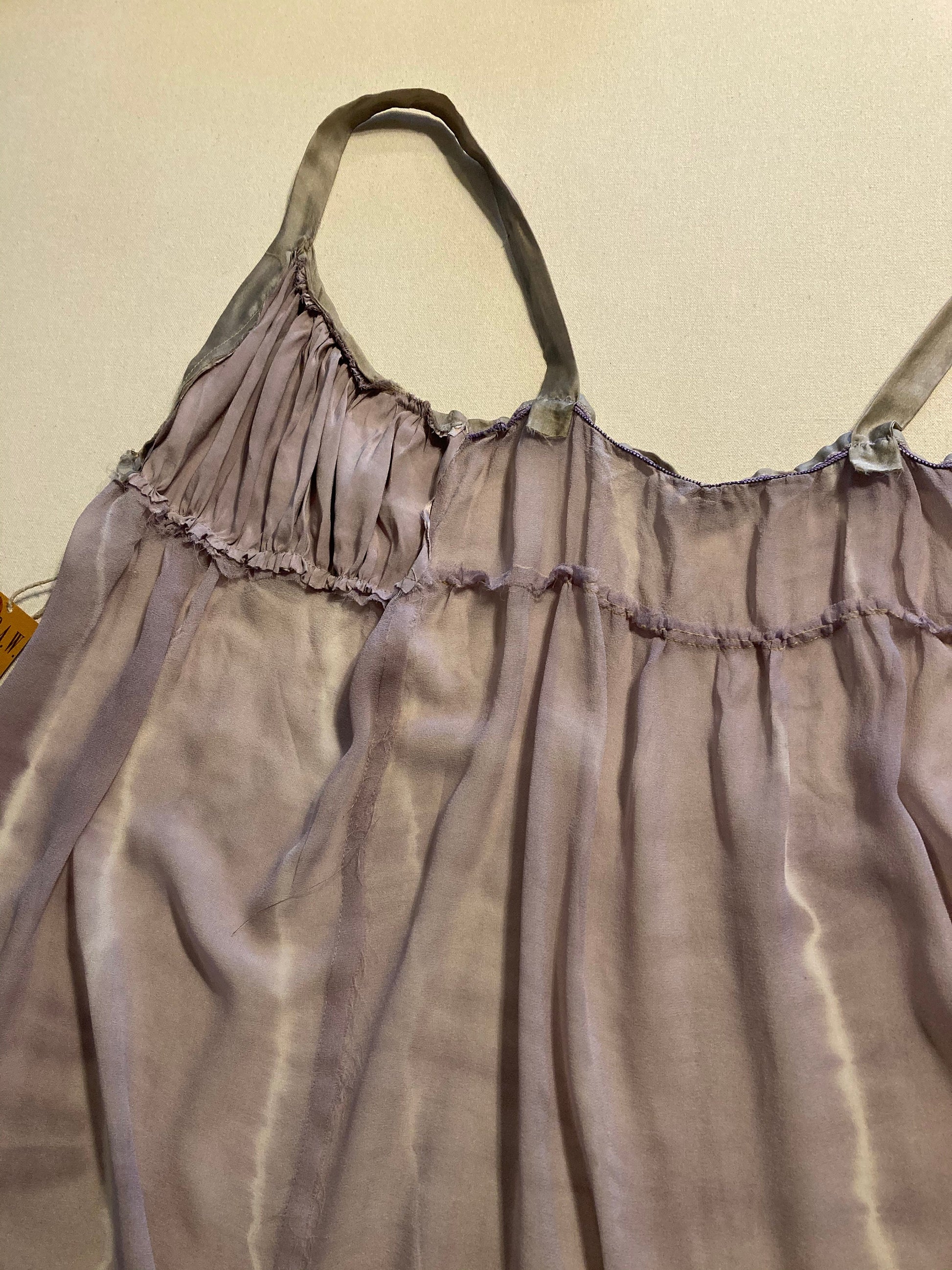 The Primrose negligee was made for the 2012 collection.  I only have the sample left and it is made with raw seams on the inside.  I am selling it as it.  The material is a combination of silk chiffon and silk charmuse with a sateen cotton/ silk details.  I dyed it with logwood  purple which comes from the heart of a logwood tree.  I call the color lilac.  there is a slight pattern made with shibori on the chiffon body.  I also  dyed the other details with a contrast natural color of charcoal.