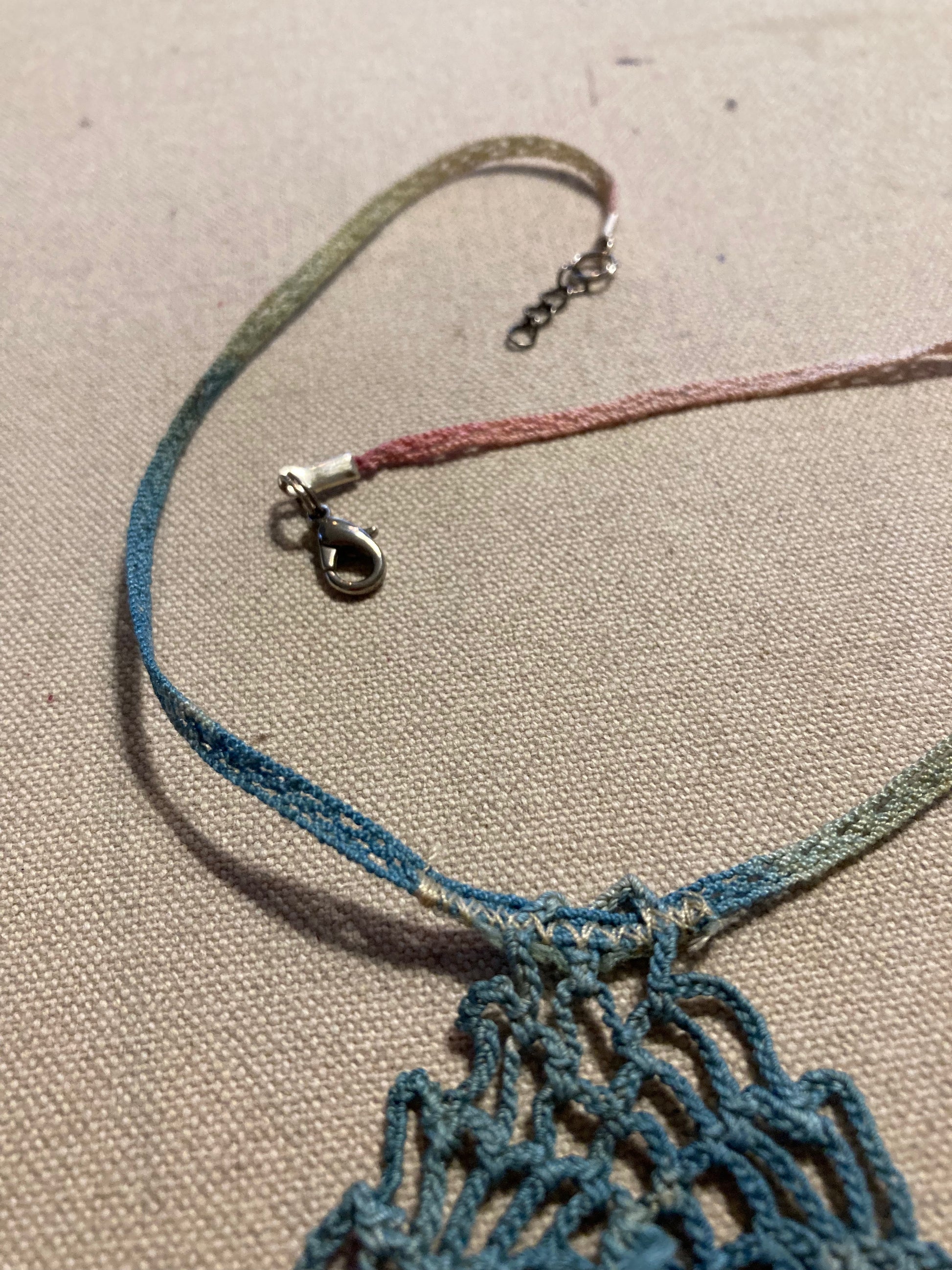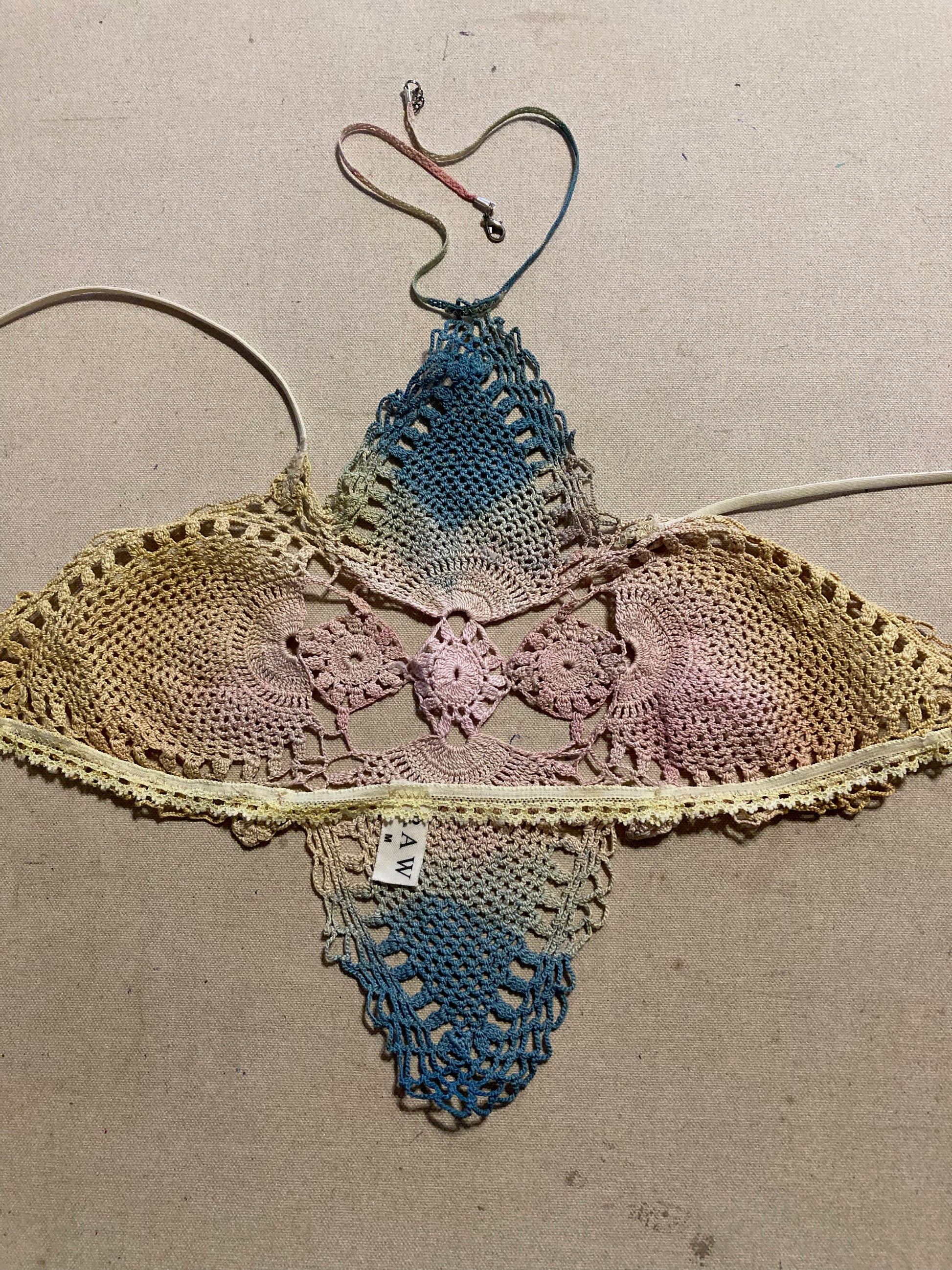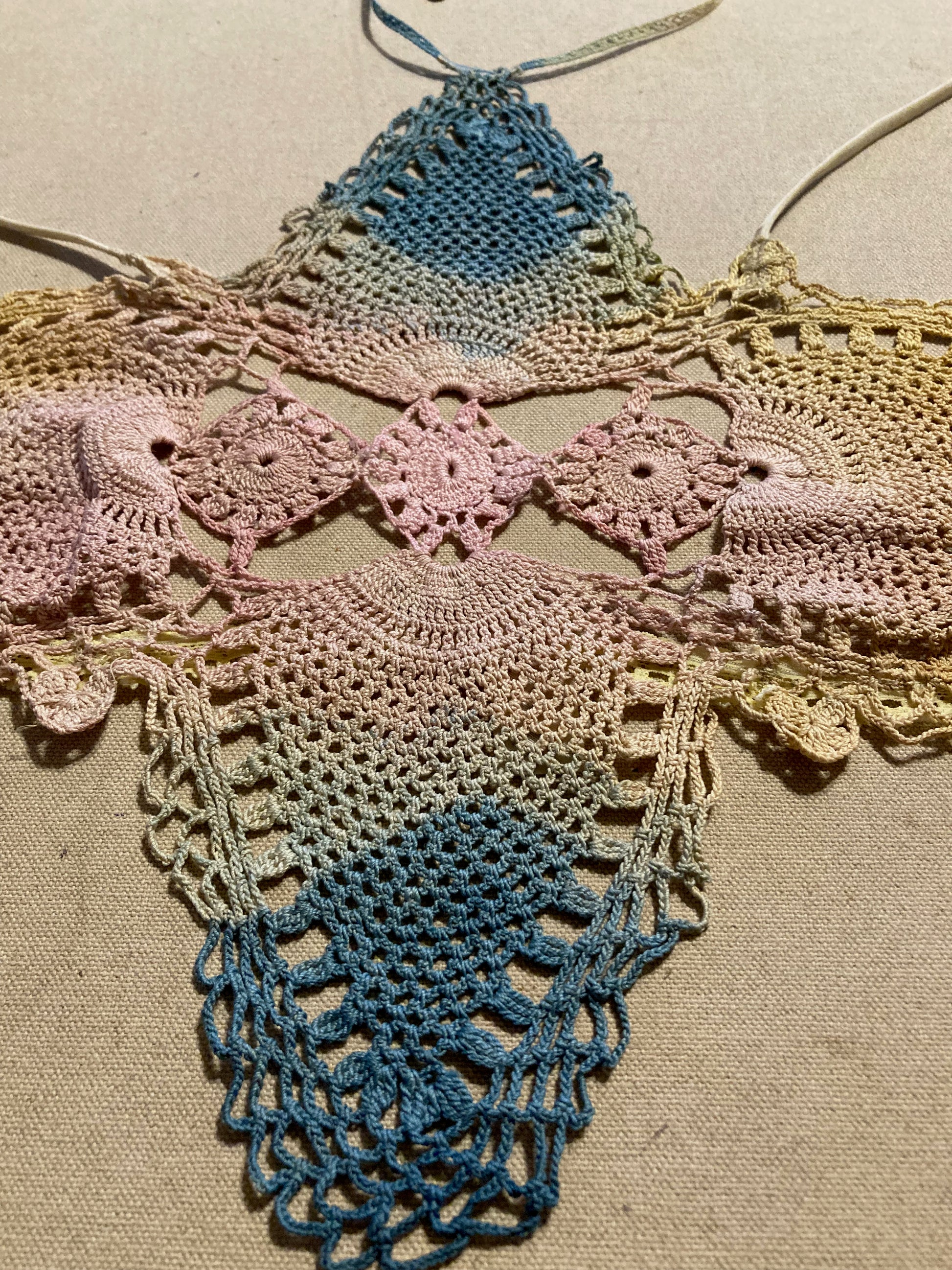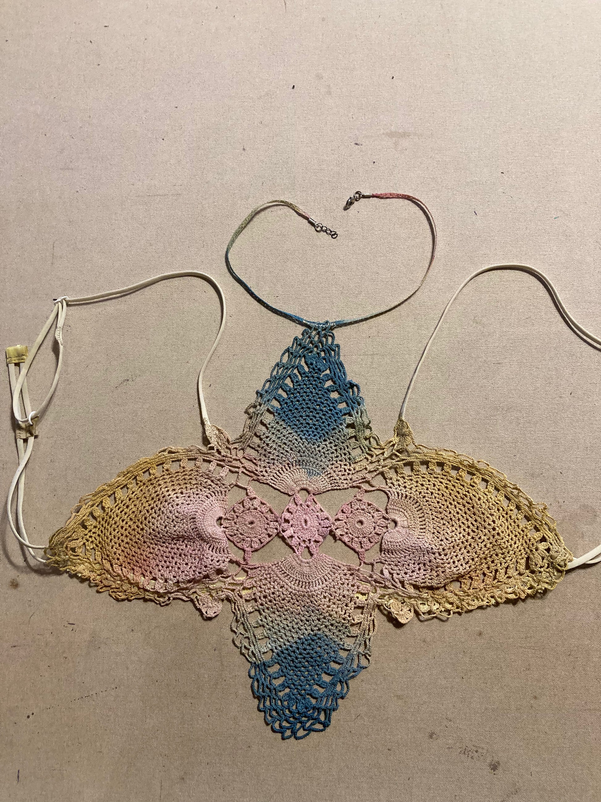 The crochet panel was dyed with indigo, cochineal, and marigold. As you can see there is a cotton ribbon fitted with a clasp to go around your neck and thin elastic straps custom made to allow for a perfect fit.