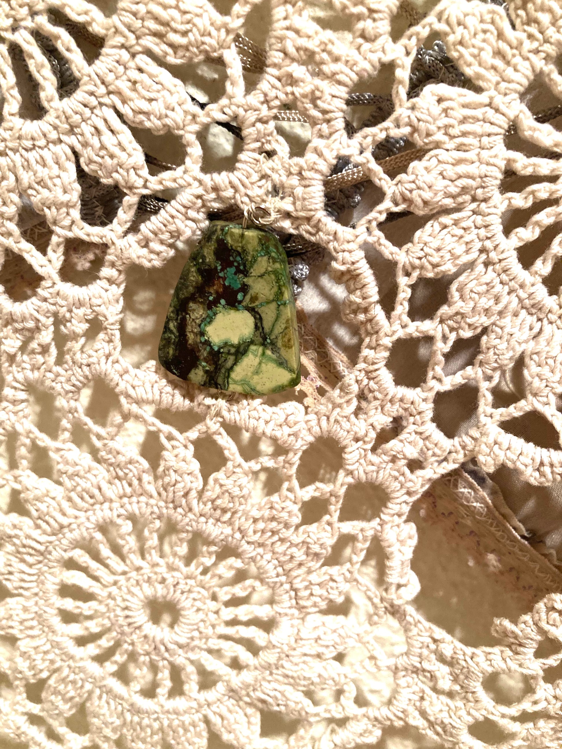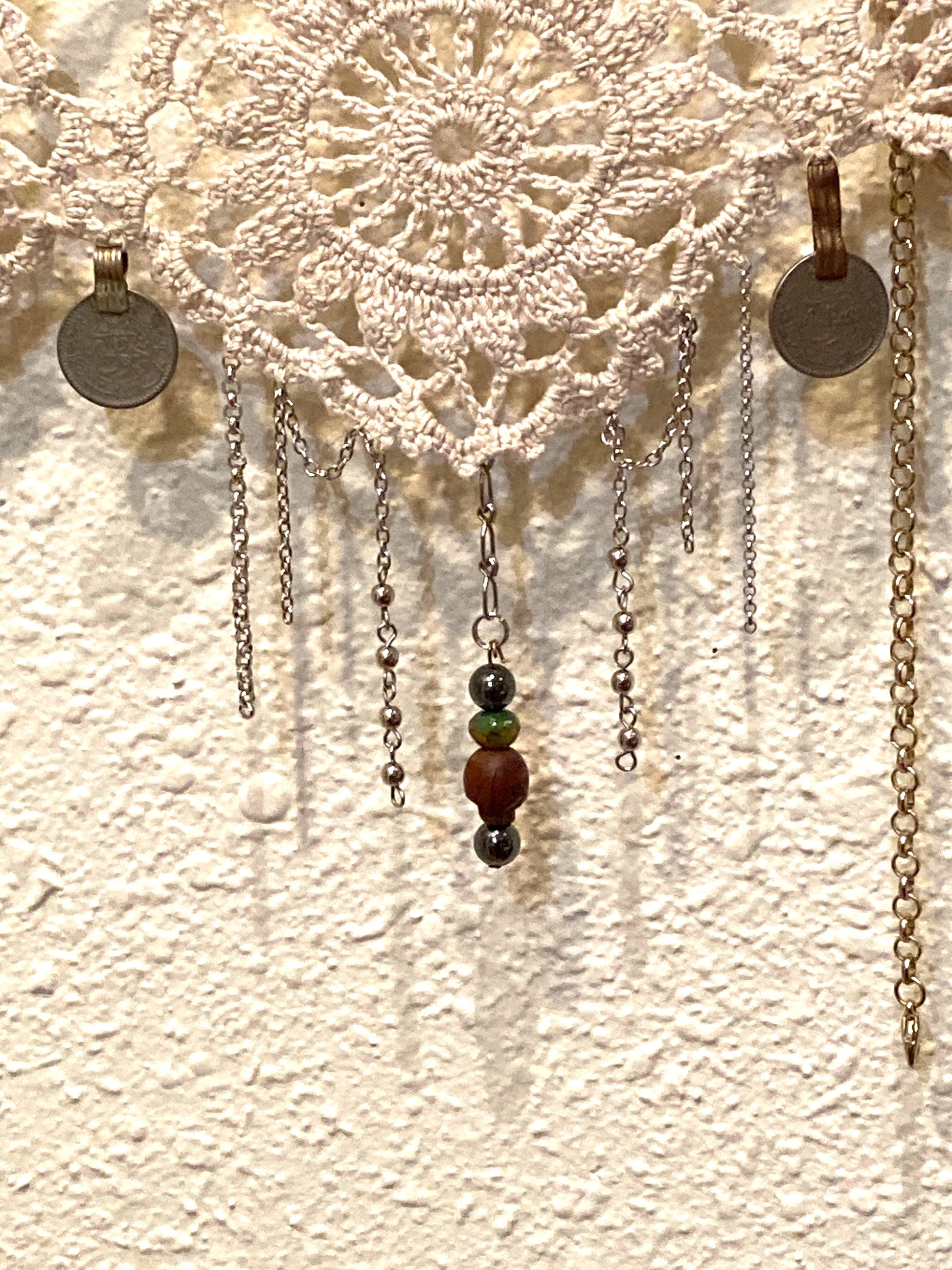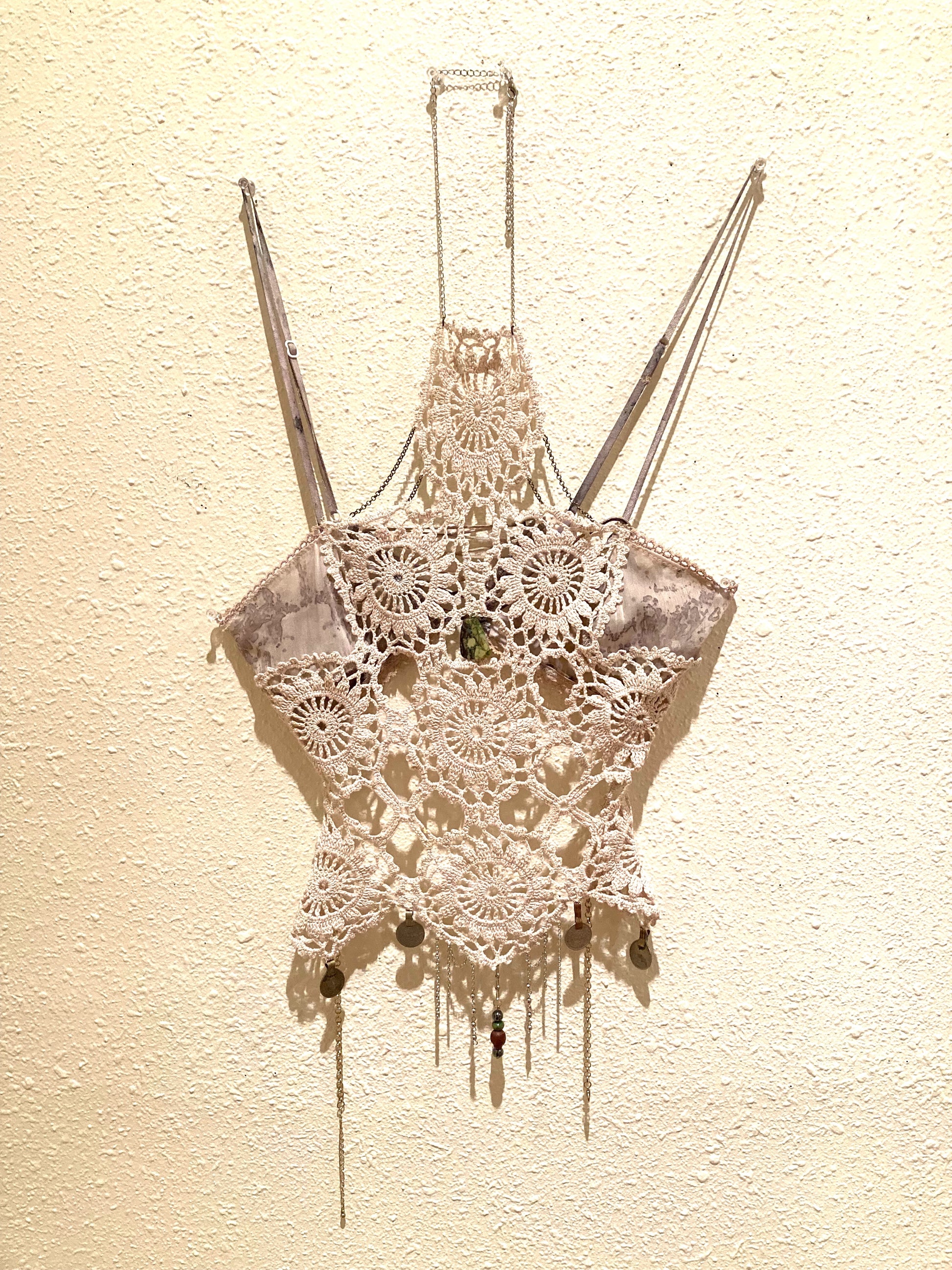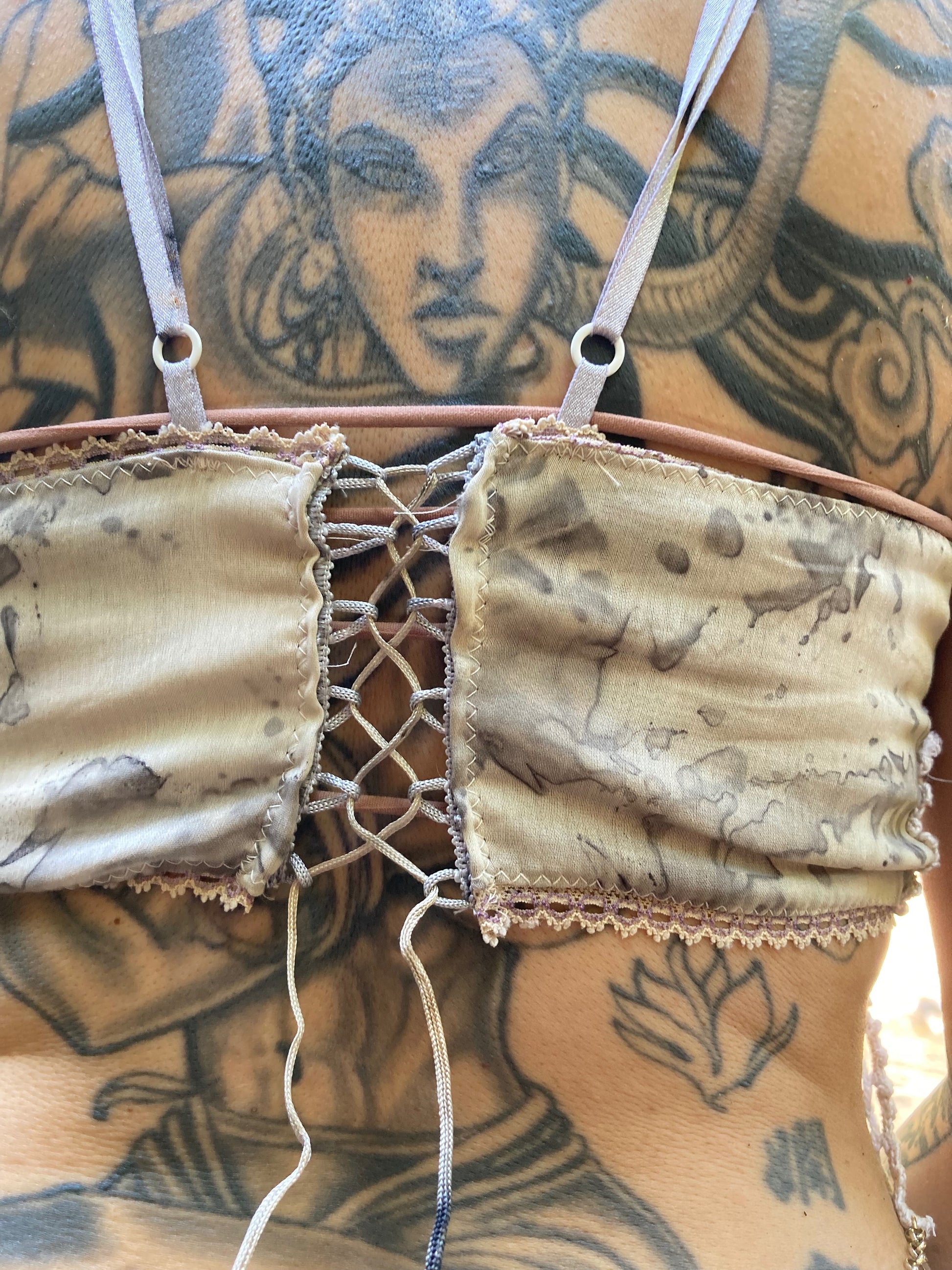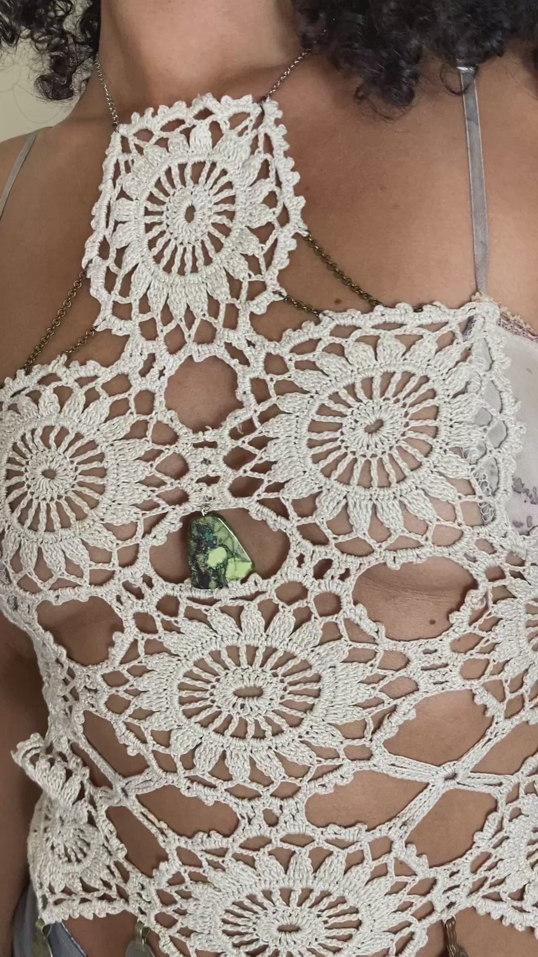 This special crochet top moves with you! Made with a cotton doily and natural dyed accents with chains and semi precious stones. There is an adjustable lace up back for fitting various sizes from small to medium and possibly large with small breasts.