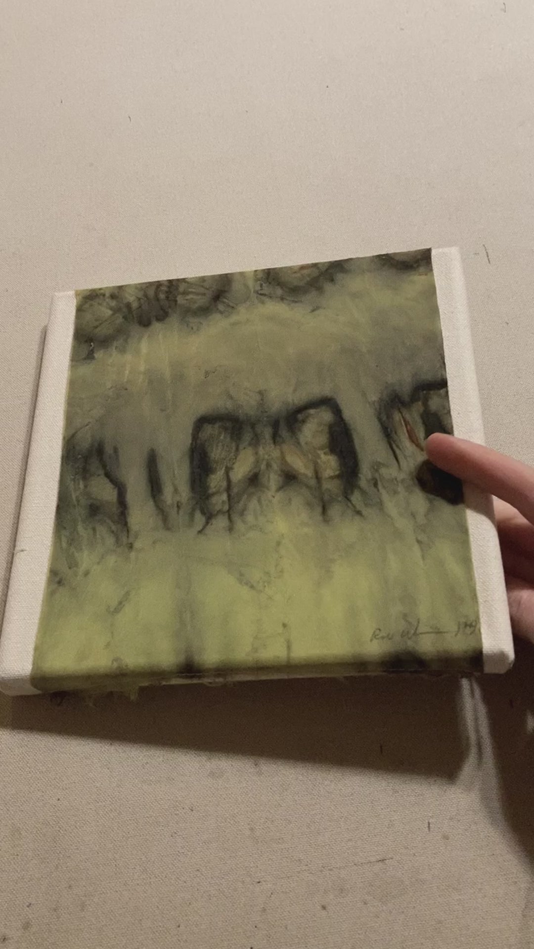 Silk sewn to canvas and stretched over frame that finishes 8x8 inches.