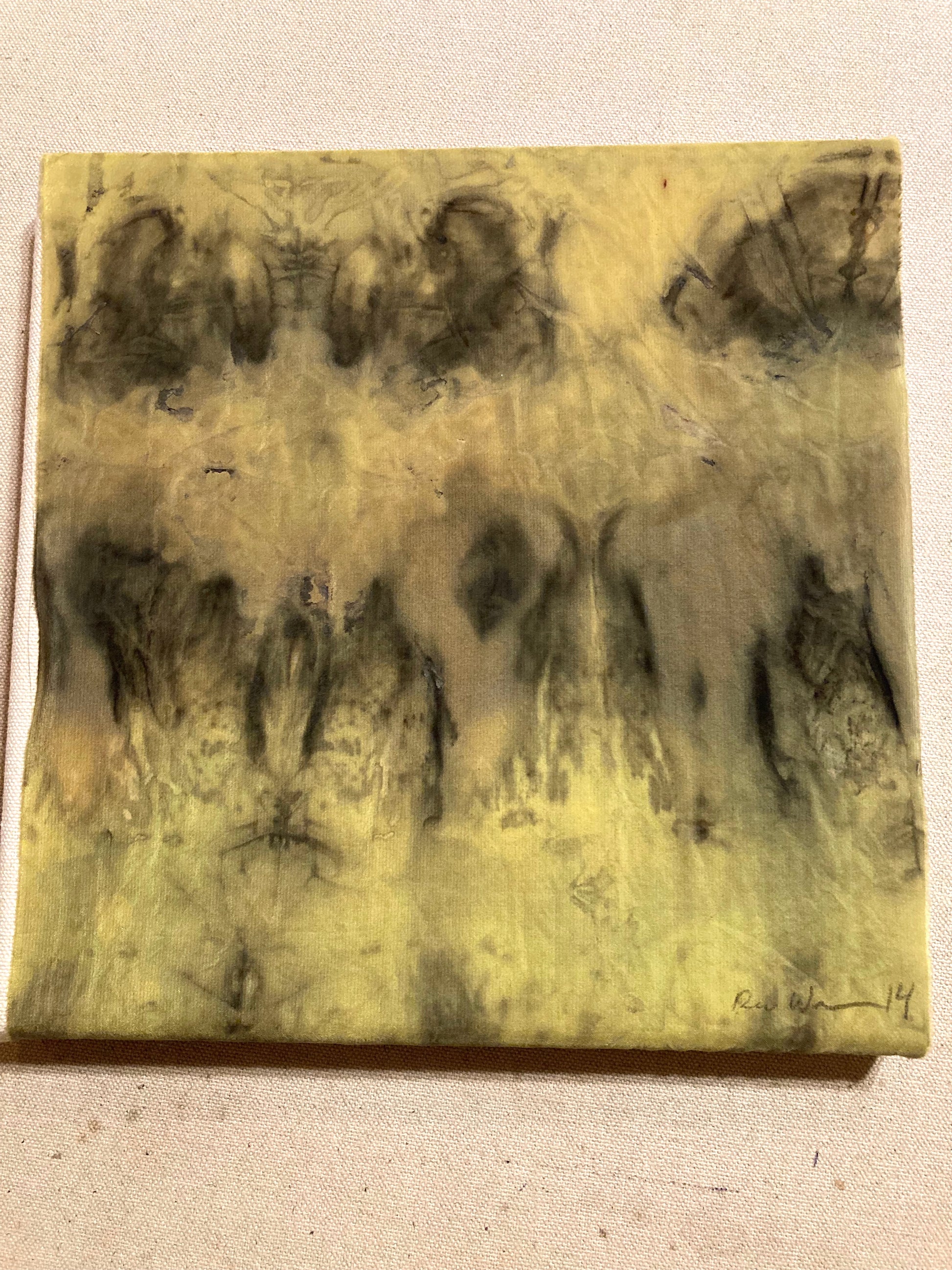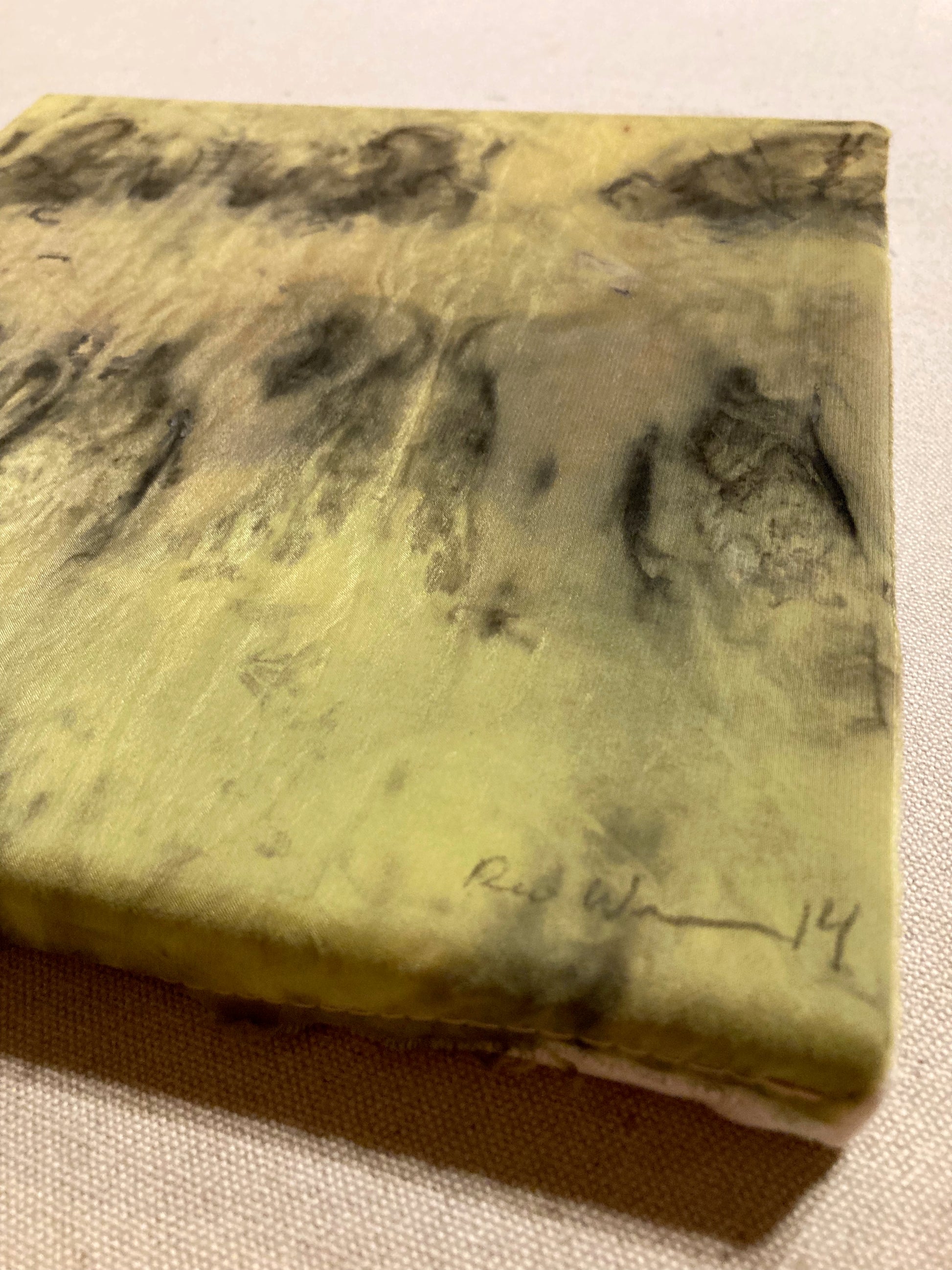 Silk sewn to canvas and stretched over frame that finishes 8x8 inches.