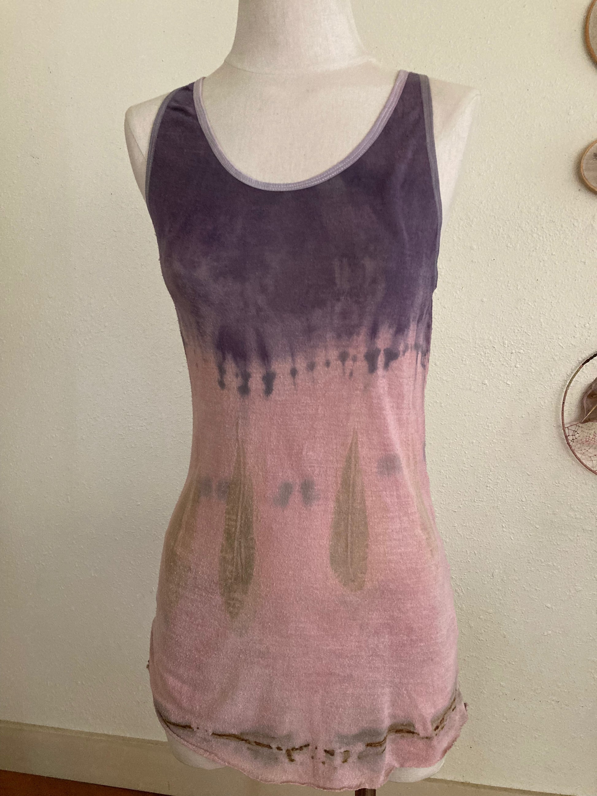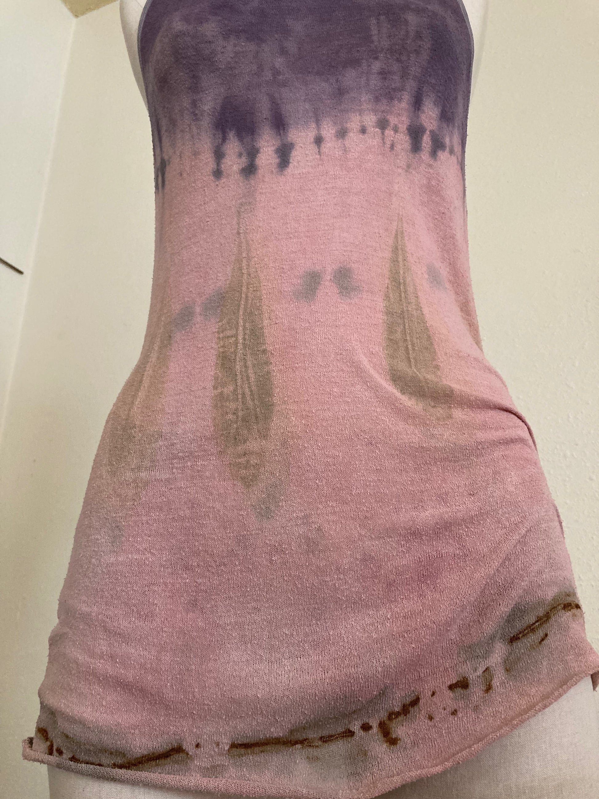 This soft and comfy silk knit tank was dyed with cochineal and logwood purple then composted with woad leaves and rust. One of a kind plant magic blessings await you in this thin, soft, stretchy, silk knit. A delicate sheer elastic that was dyed in house, trims the neck line. The bottom has a raw edge.