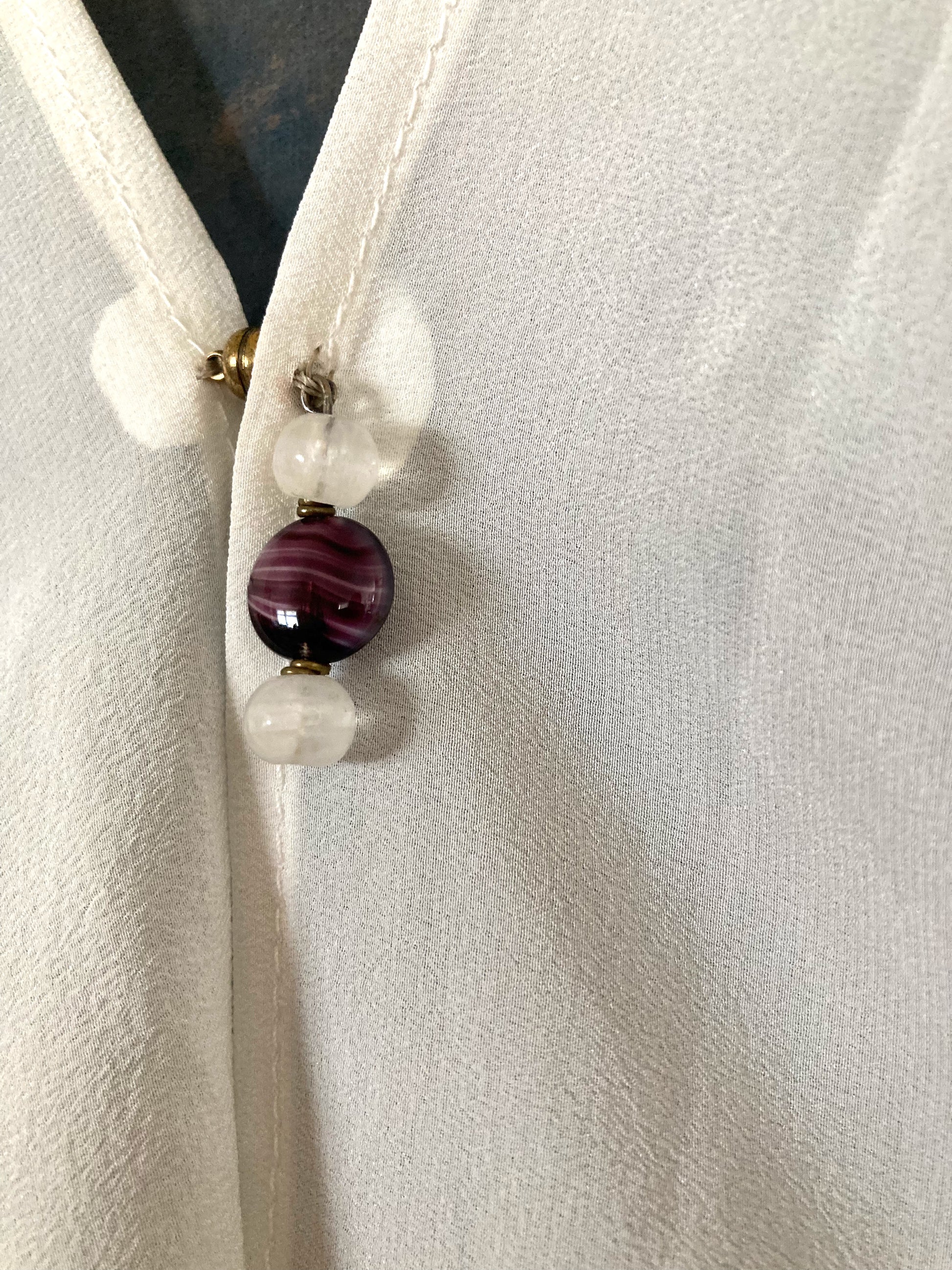 There is a magnetic clasp at the neck line to lightly secure. I have custom handcrafted each charm with semi precious stones and beads. They are all unique and it is a surprise in which one you will get. The edges are hand rolled and machine stitched.