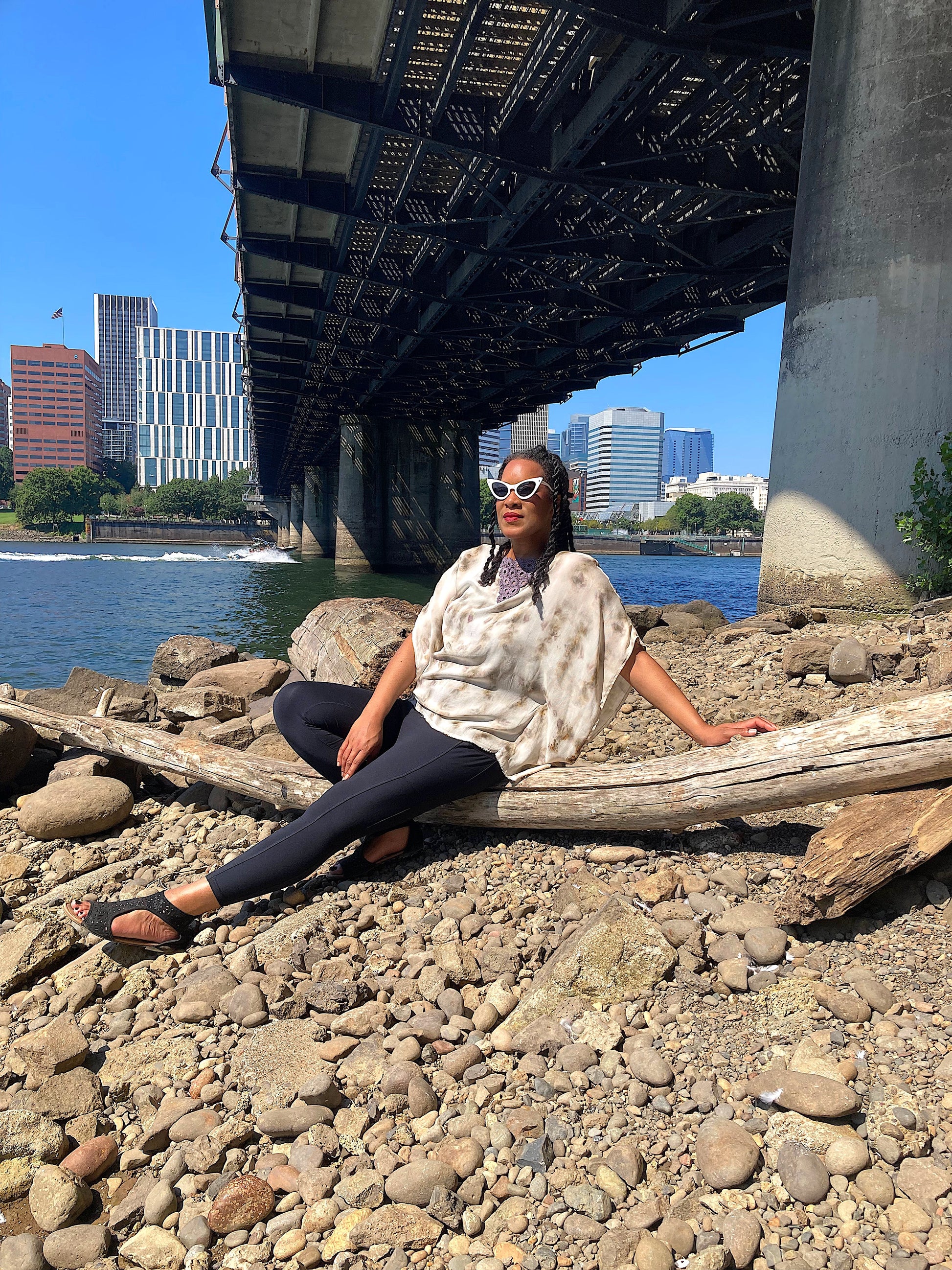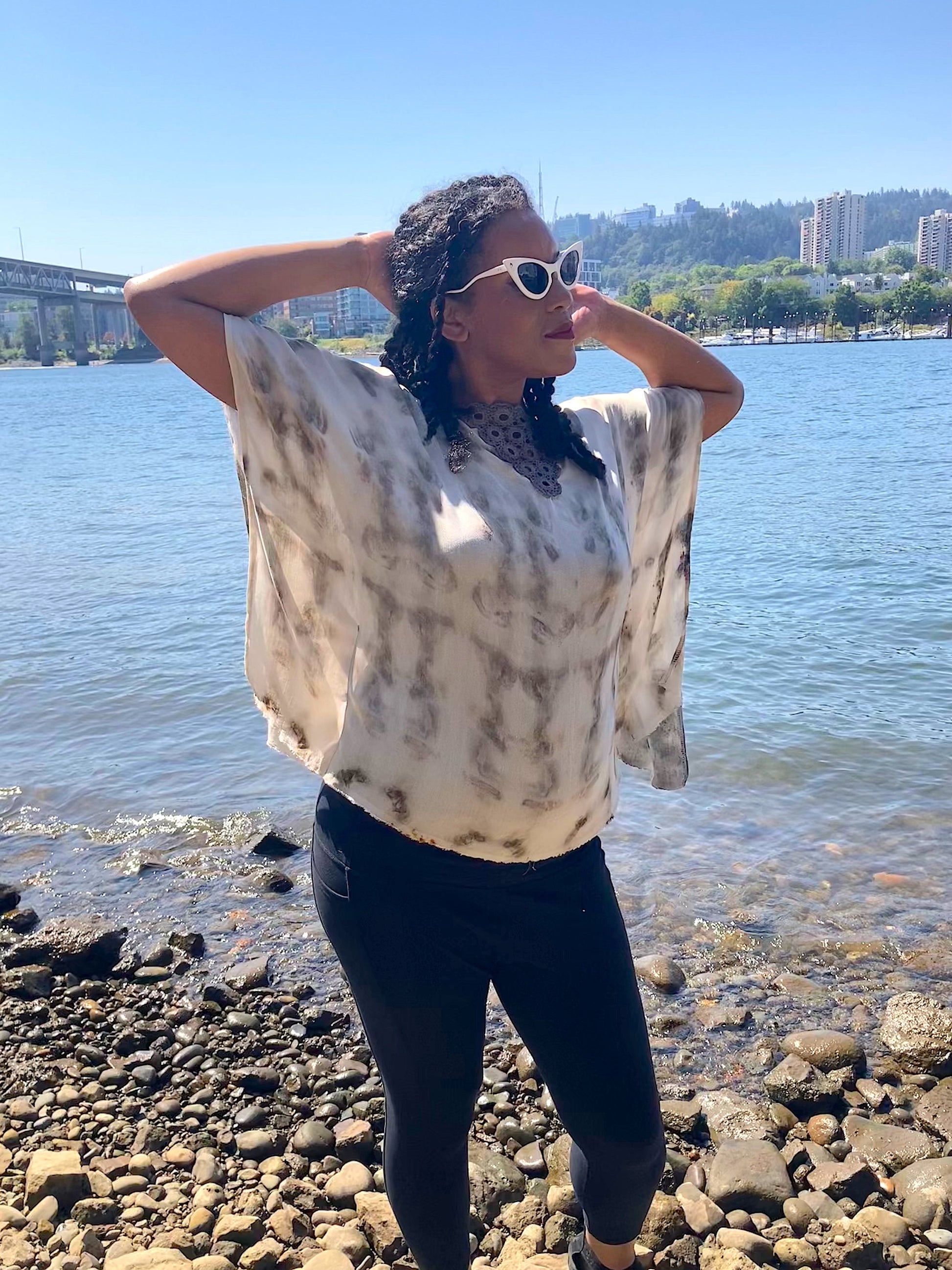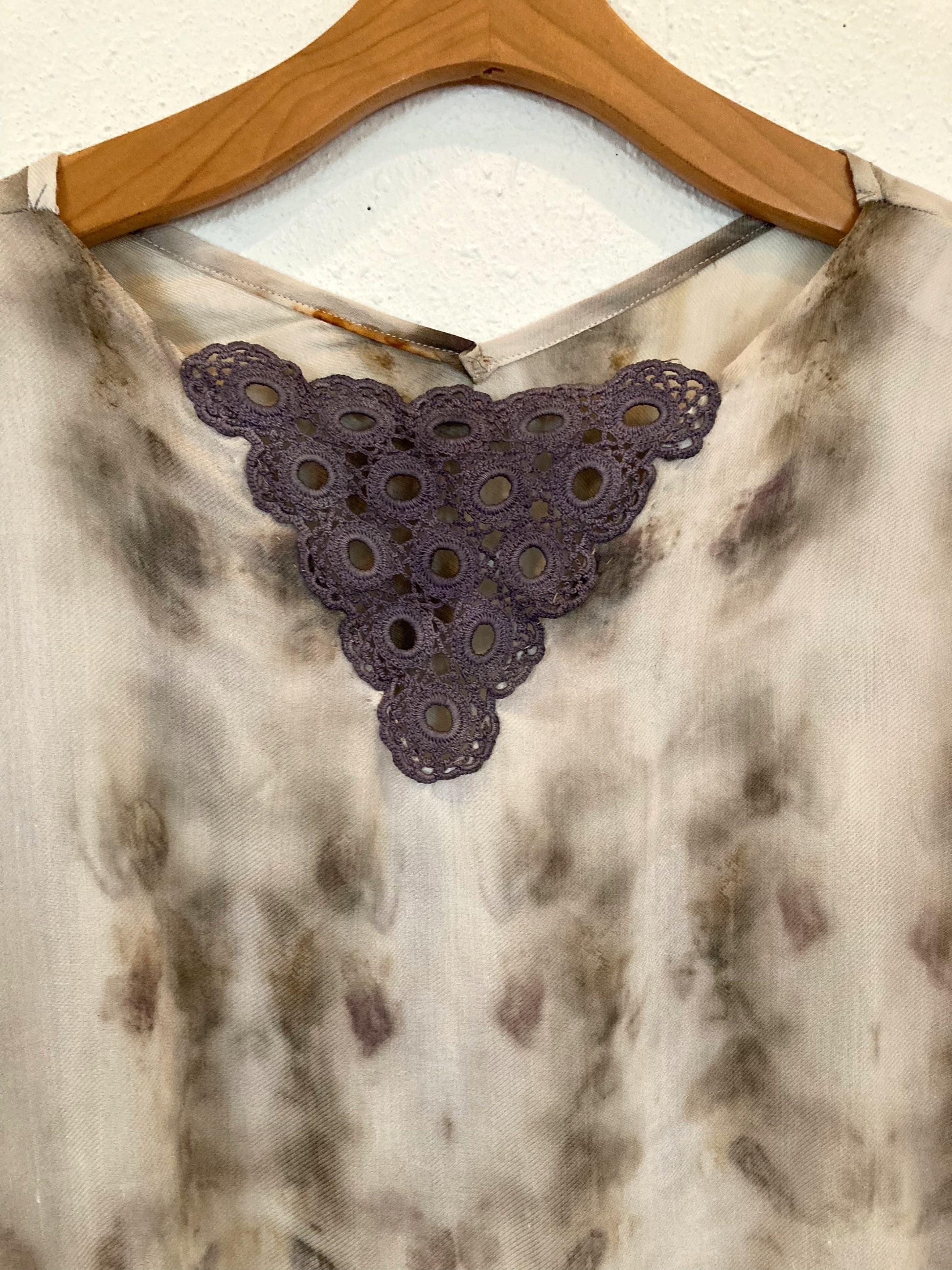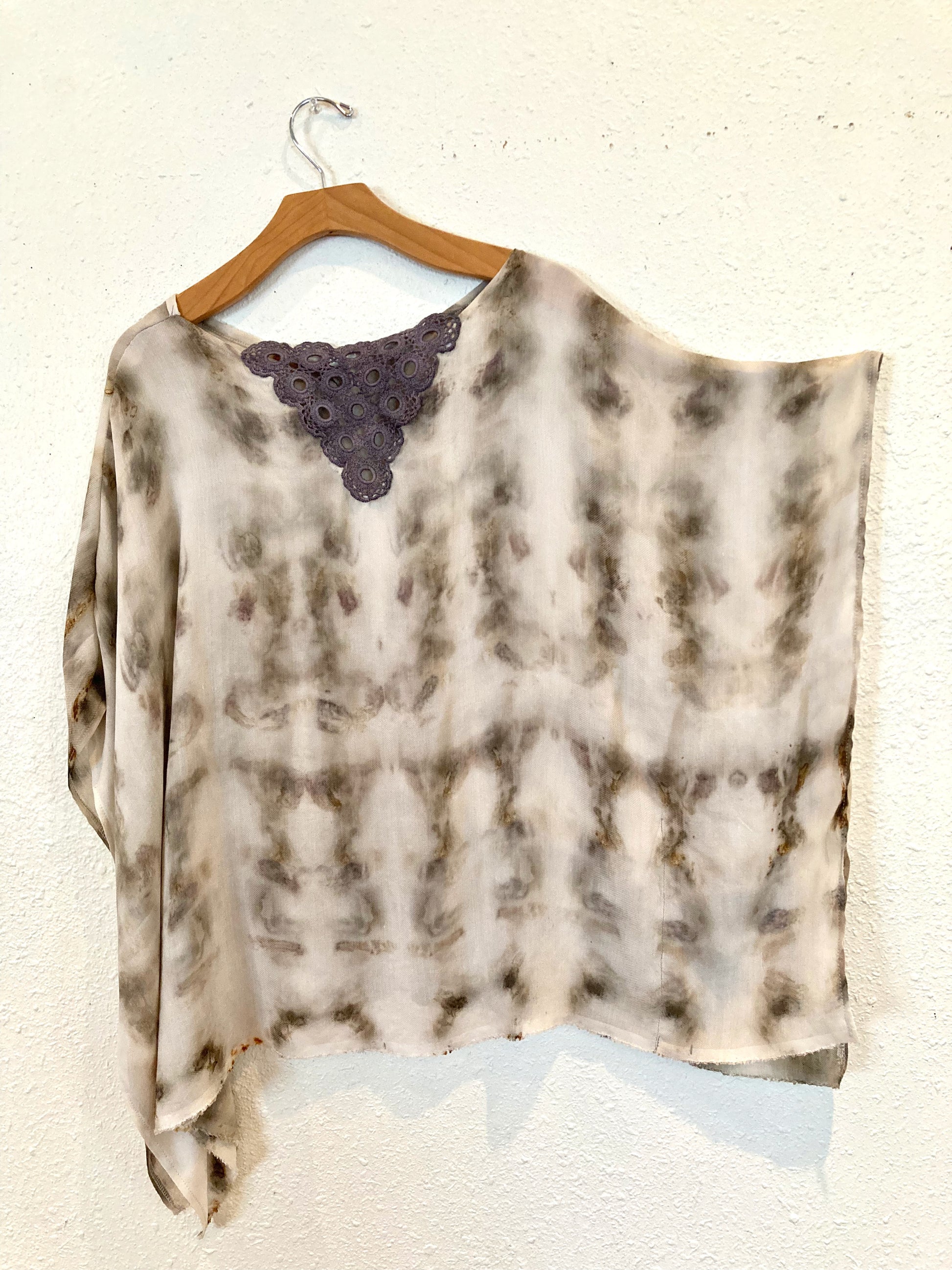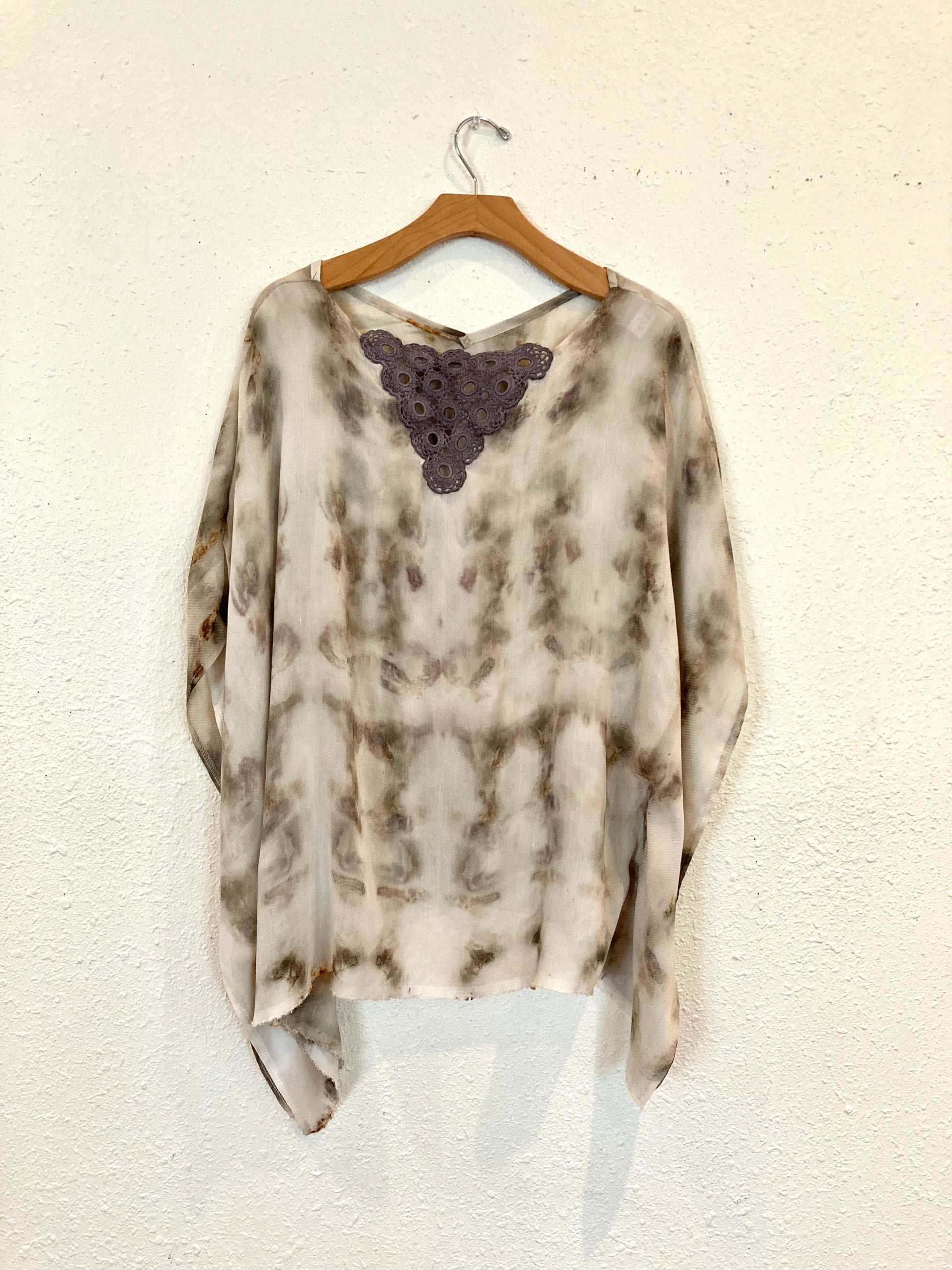 Cut to the kiss the hips with a butterfly quality. The neck has a cotton crochet piece that has been natural dyed with various shades of plants and minerals.
