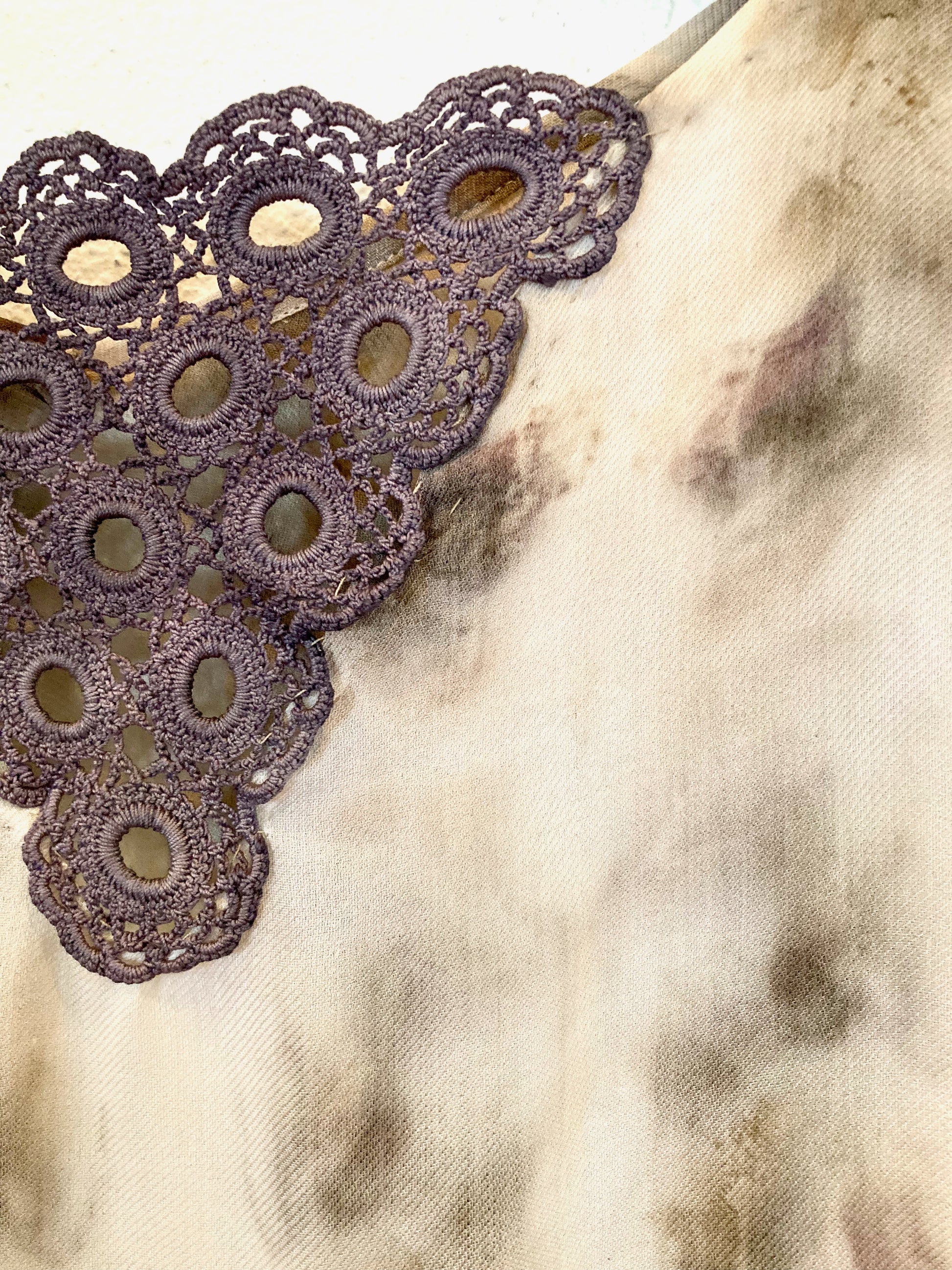 Hollyhock - This silk wool blend has a soft and light touch with a twill weave.  Dyed with hollyhock and rust  by composting. Cotton crochet triangle dyed with logwood.