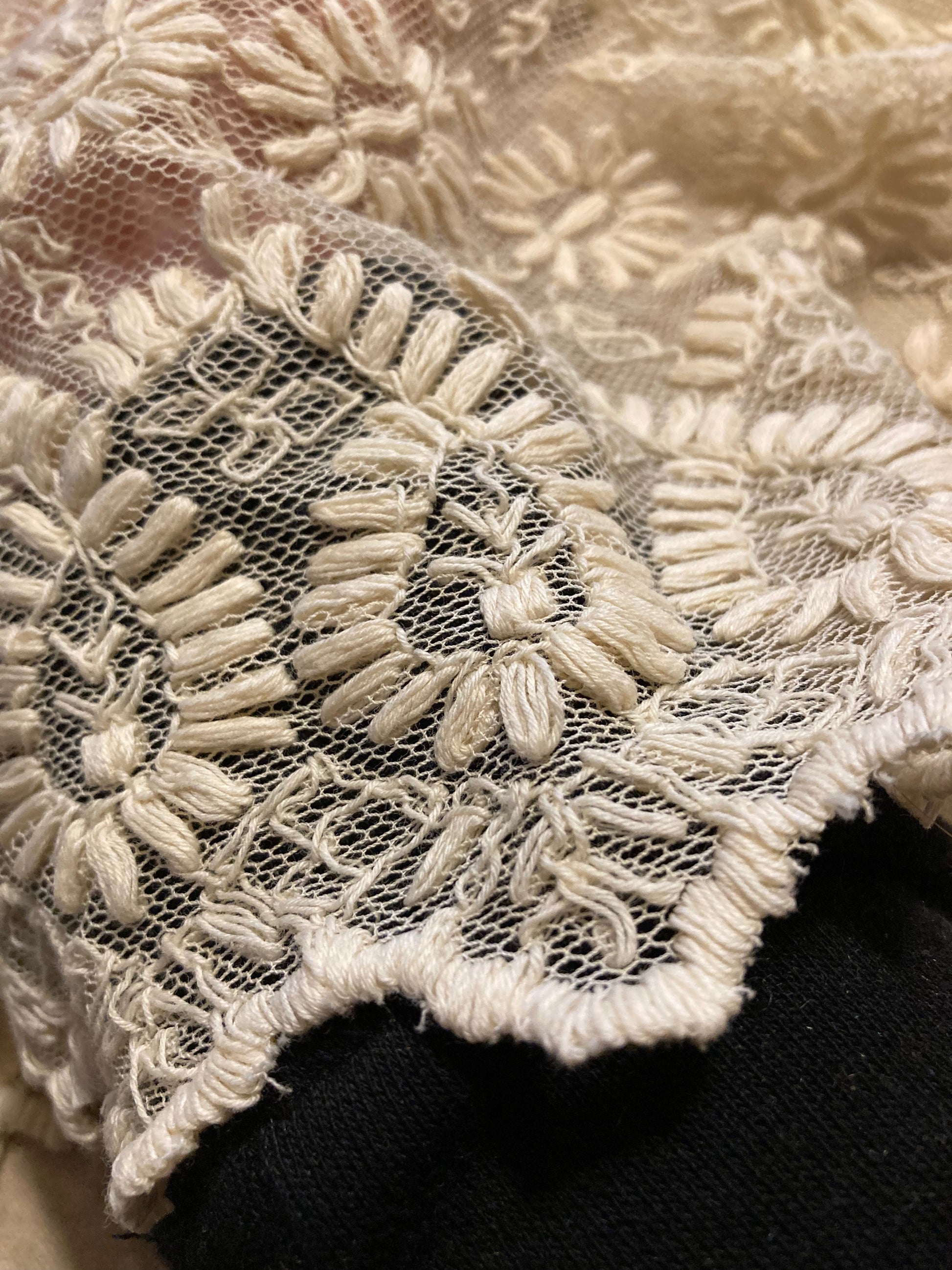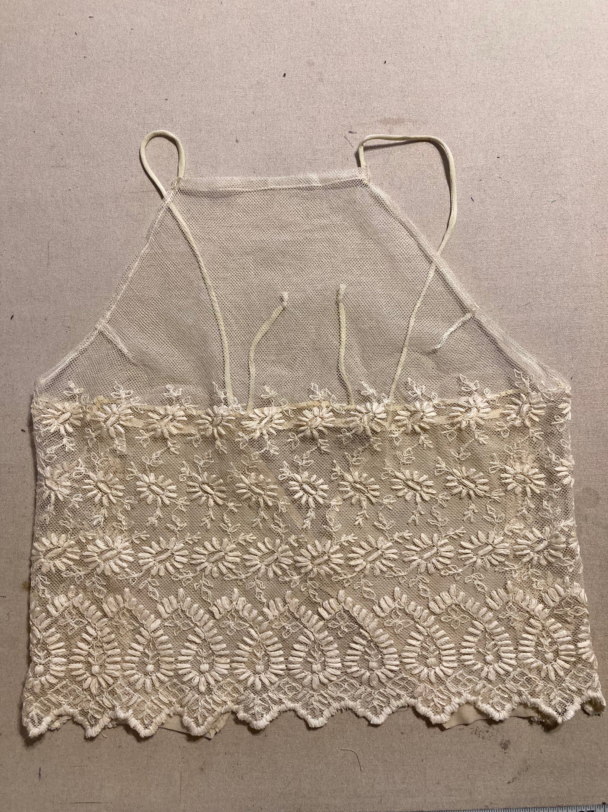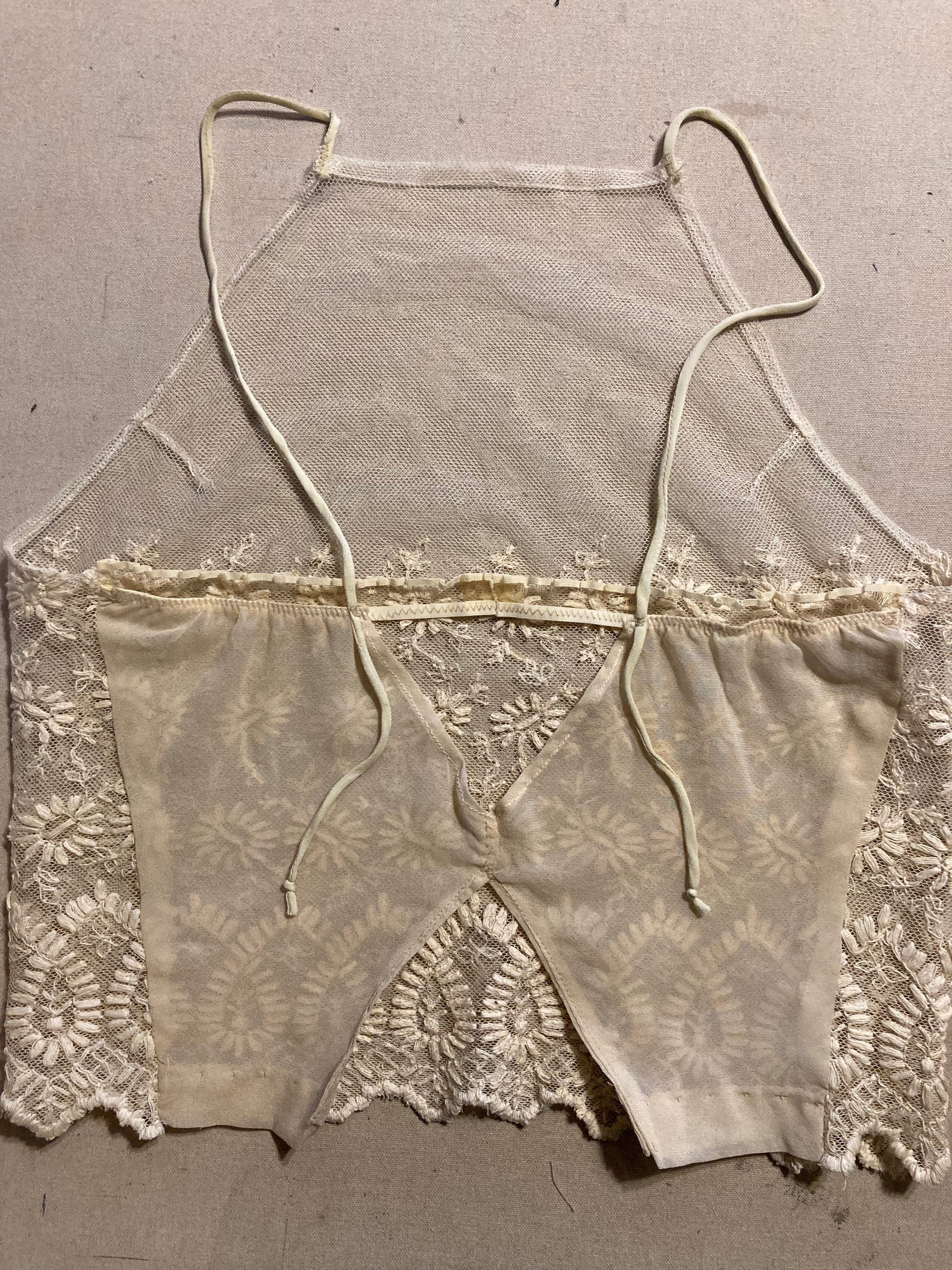 This unique camisole is made with a vintage lace that is textured with a thread pattern and netted. I am not 100% sure but I think it is a cotton silk blend.
